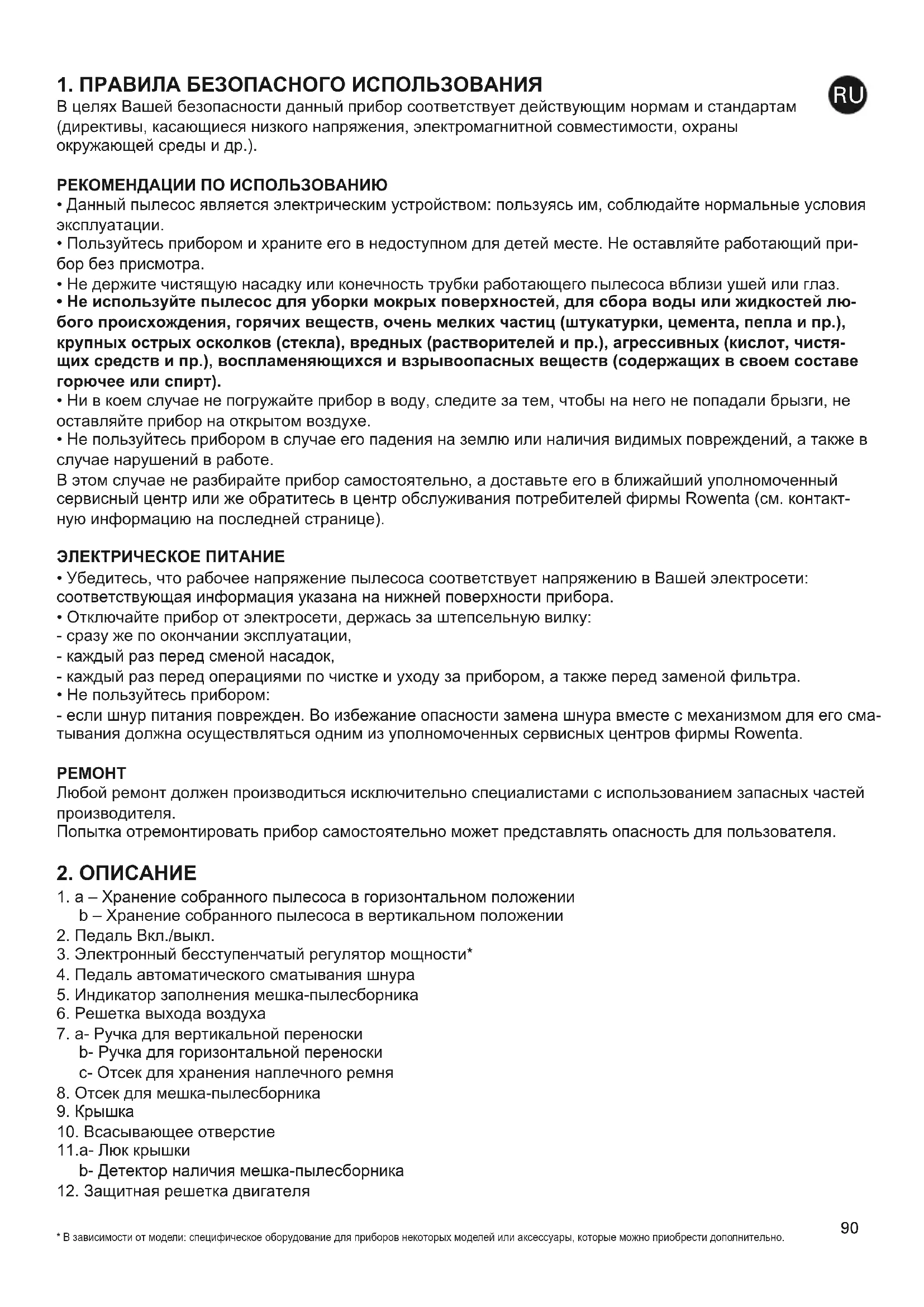 - Перед тем, как пользоваться прибором, внимательно прочитайте инструкцию по эксплуатации: несо- блюдение перечисленных в ней правил освобождает фирму Rowenta от любой ответственности.
