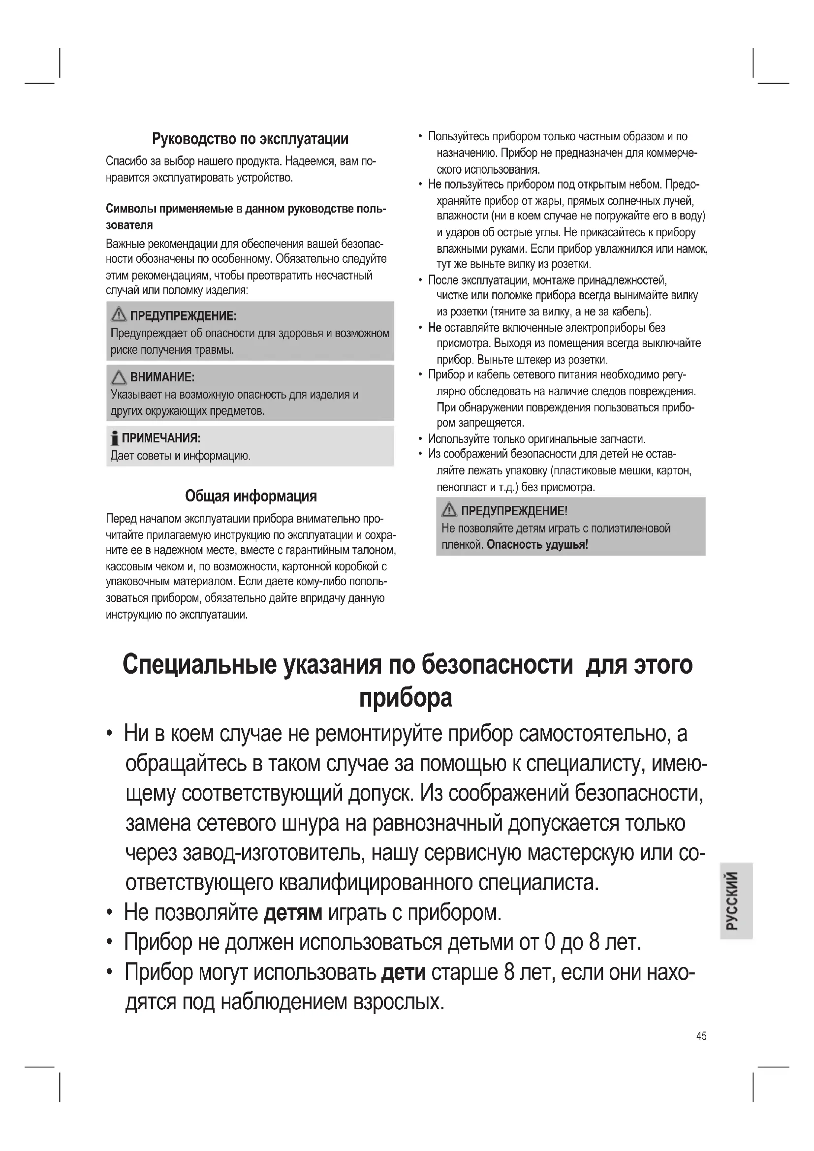- Из соображений безопасности для детей не остав- ляйте лежать упаковку (пластиковые мешки, картон, пенопласт и т.д.) без присмотра. ПРЕДУПРЕЖДЕНИЕ! Не позволяйте детям играть с полиэтиленовой пленкой. Опасность удушья! Руководство по эксплуатации Спасибо за выбор нашего продукта. Надеемся, вам по- нравится эксплуатировать устройство. Символы применяемые в данном руководстве поль-