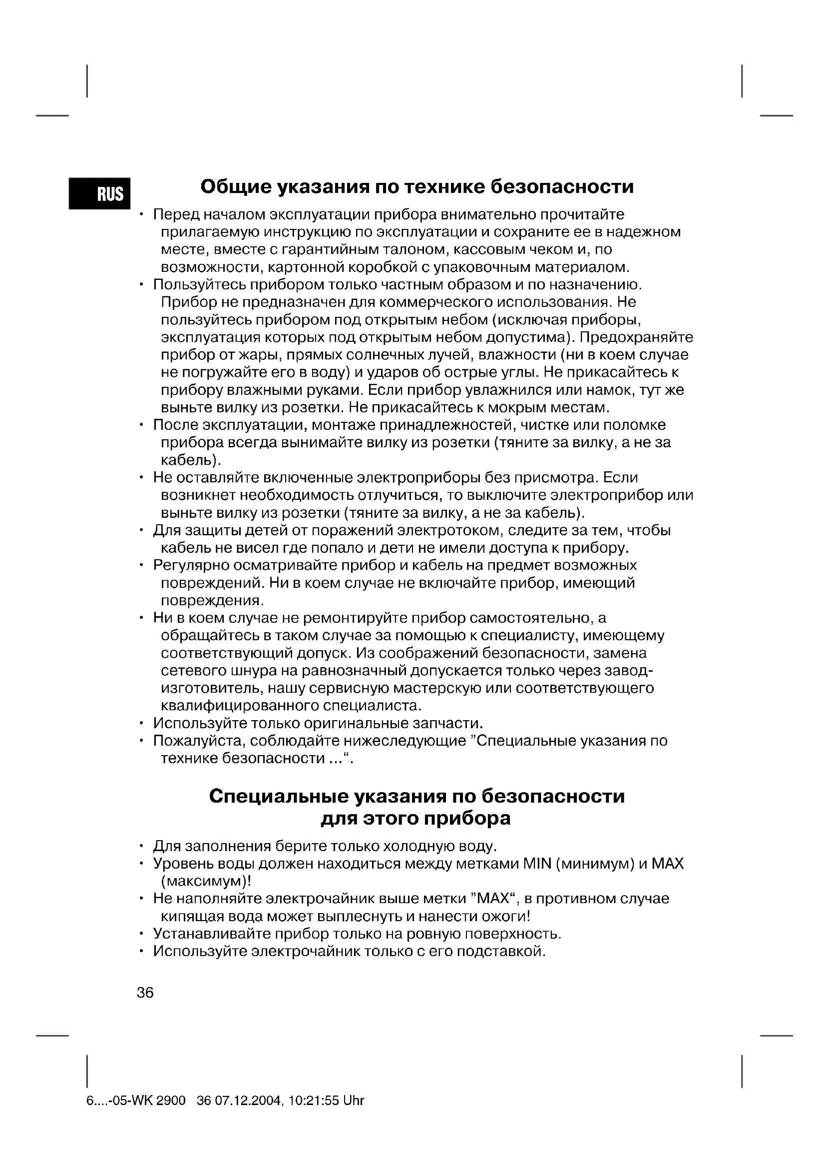 - Используйте электрочайник только с его подставкой. 6....-05-WK 2900 36 07.12.2004, 10:21:55 UhrRUS