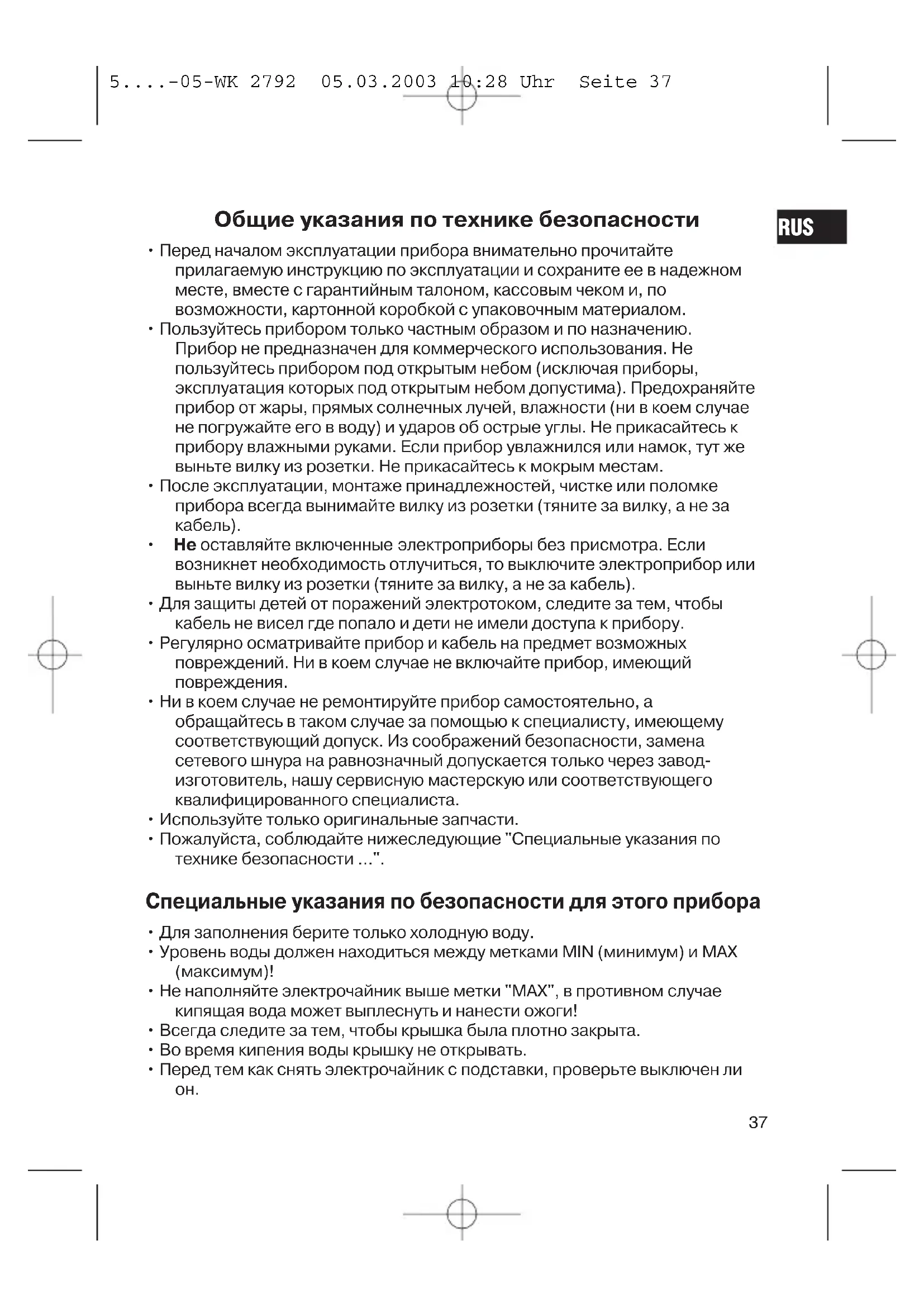 RUS 5....-05-WK 2792 05.03.2003 10:28 Uhr Seite 37• Используйте электрочайник только с его подставкой.