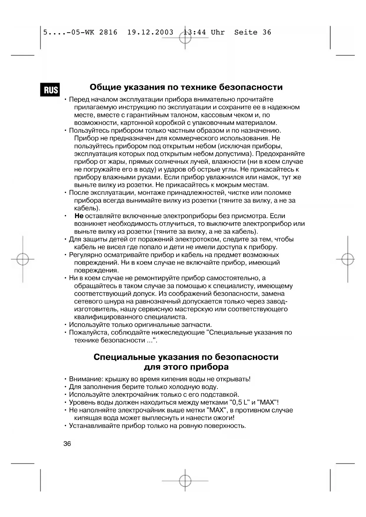 RUS 5....-05-WK 2816 19.12.2003 13:44 Uhr Seite 36• До того, как Вы снимаете прибор с основания, выключайте его.