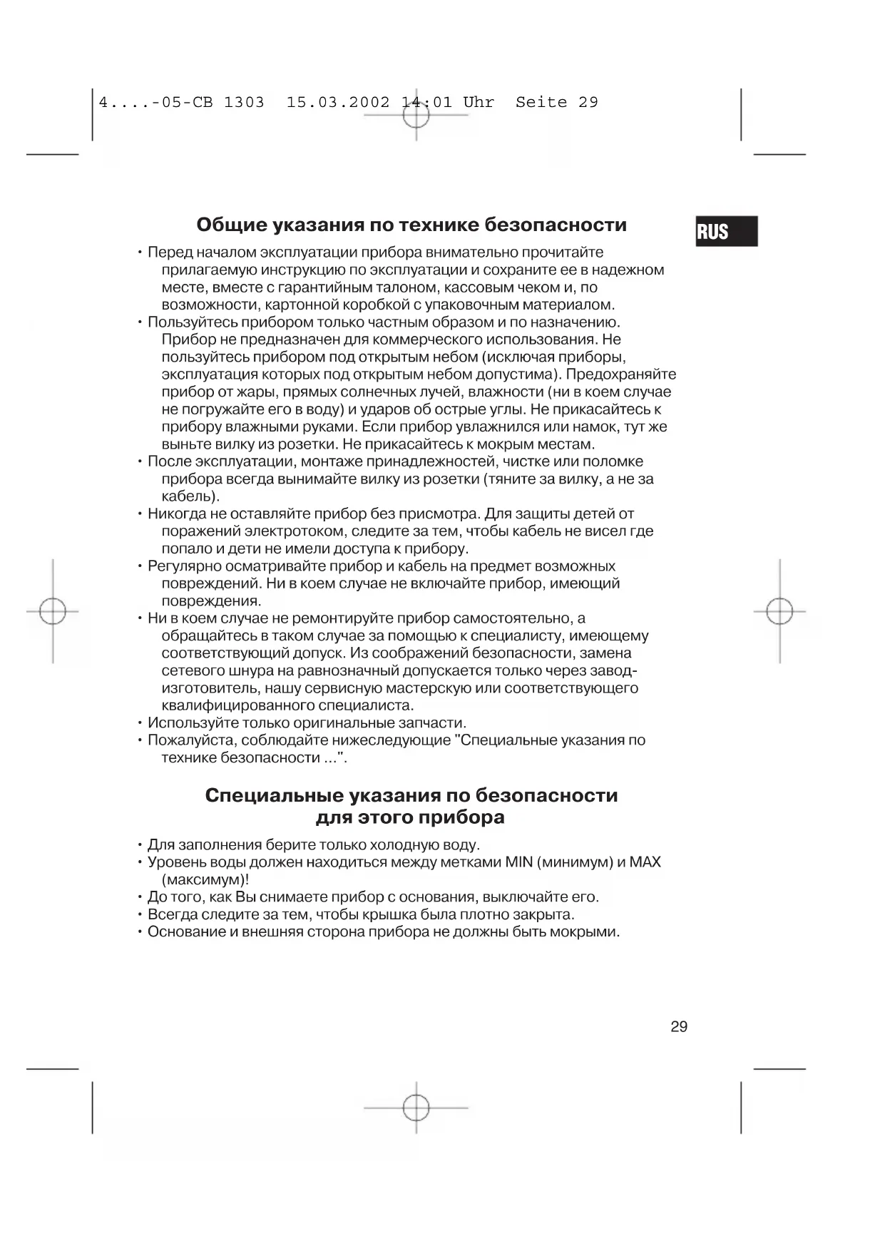 RUS 4....-05-CB 1303 15.03.2002 14:01 Uhr Seite 29Ввод прибора в эксплуатацию Пожалуйста, внимательно прочитайте прилагаемую инструкцию по эксплуатации и отложьте ее на хранение в надежное место. Перед первым пользованием электрочайником прокипятите его 2 раза с применением только свежей воды - пожалуйста, применяйте только чистую воду, без