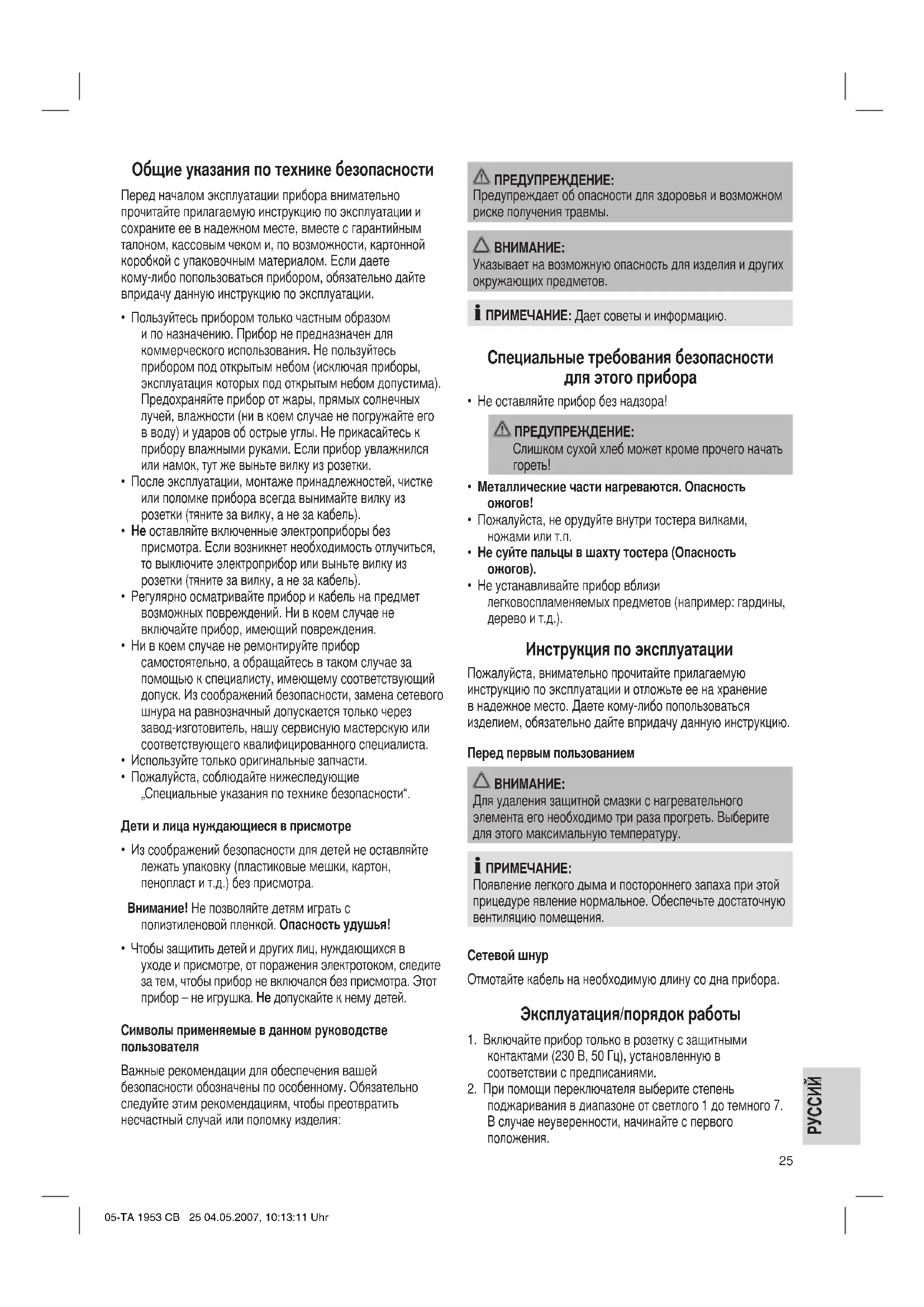 - Вытяните выдвижную полку для хлебных крошек, вытряхните из нее остатки хлеба и вставьте ее обратно. Технические данные Модель: ..................................................................... TA 1953 CB Электропитание:...................................................... Потребляемая мощность:.................................................850 B Класс защиты:............................................................................. Ι Это изделение прошло все необходимые и актуальные проверки, предписанные директивой СЕ, к прим. на электромагнитную совместимость и соответствие требованиям к низковольтной технике, оно было также сконструировано и построено с учетом последних требований по технике безопасности. Мы оставляем за собой право на технические изменения! Гарантийное обязательство Гарантийный срок на территории Российской Федерации устанавливается полномочными представителями. Кассовый чек является гарантийным талоном. Без него невозможен бесплатный ремонт или замена изделия. В случае возникновжния притензий по гарантии, предъявите изделие в полнойкомплектации, с оригинальной упаковкой и кассовым чеком торговой точке, продавшей это изделие. Дефекты изнашиваемых принадлежностей или трущихся деталей, а также чистка, техобслуживание или замена трущихся деталей не попадают под гарантию, и поэтому проводятся за отдельную оплату! Гарантия теряется при вскрытии изделия посторонними