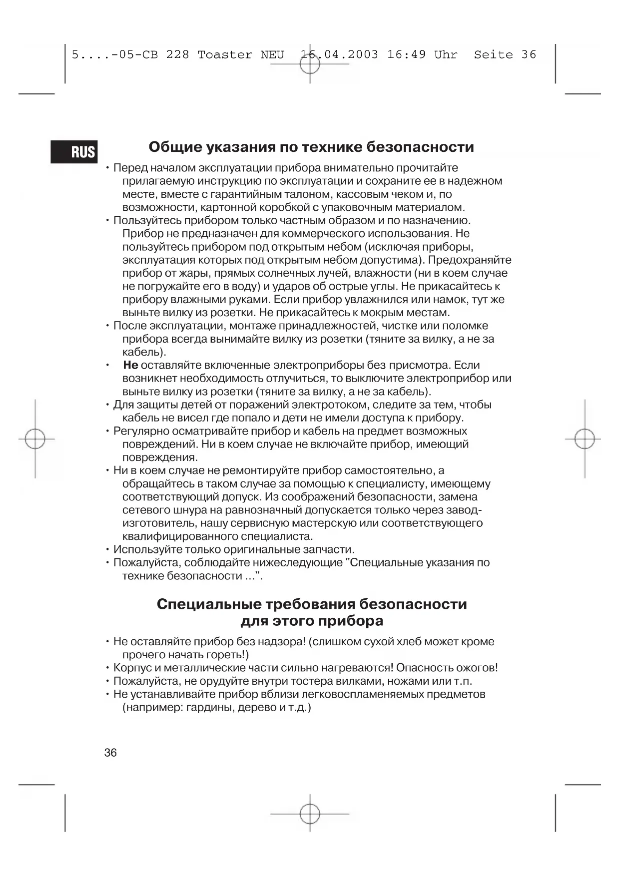 RUS 5....-05-CB 228 Toaster NEU 16.04.2003 16:49 Uhr Seite 36Перед первым пользованием Для удаления защитной смазки с нагревательного элемента его необходимо три раза прогреть. Выберите для этого максимальную температуру. Появление легкого дыма и постороннего запаха при этой прицедуре явление нормальное. Обеспечьте достаточную вентиляцию помещения. Эксплуатация/порядок работы
