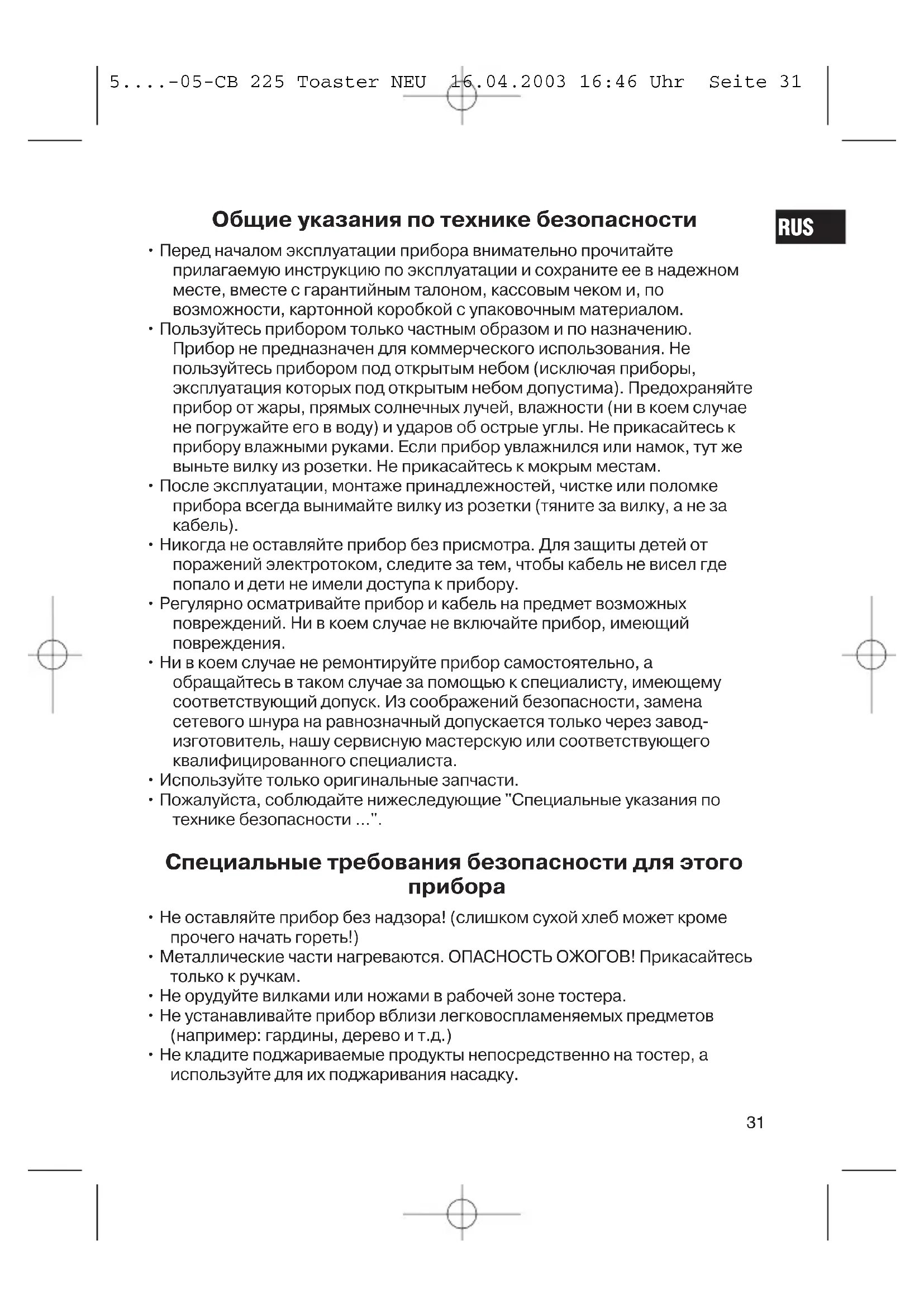 RUS 5....-05-CB 225 Toaster NEU 16.04.2003 16:46 Uhr Seite 31Перед первым пользованием Для удаления защитной смазки с нагревательного элемента его необходимо три раза прогреть. Выберите для этого максимальную температуру. Появление легкого дыма и постороннего запаха при этой прицедуре явление нормальное. Обеспечьте достаточную вентиляцию помещения. Эксплуатация/порядок работы Изображение элементов управления 1 Рашпер 5 Рычаг салазок 2 Пазы тостера 6 Контрольная лампочка 3 Регулятор уровня поджаривания 7 Кнопка режима размораживания 4 Кнопка-Стоп 8 Выдвижной ящик для крошек (на задней стороне прибора)