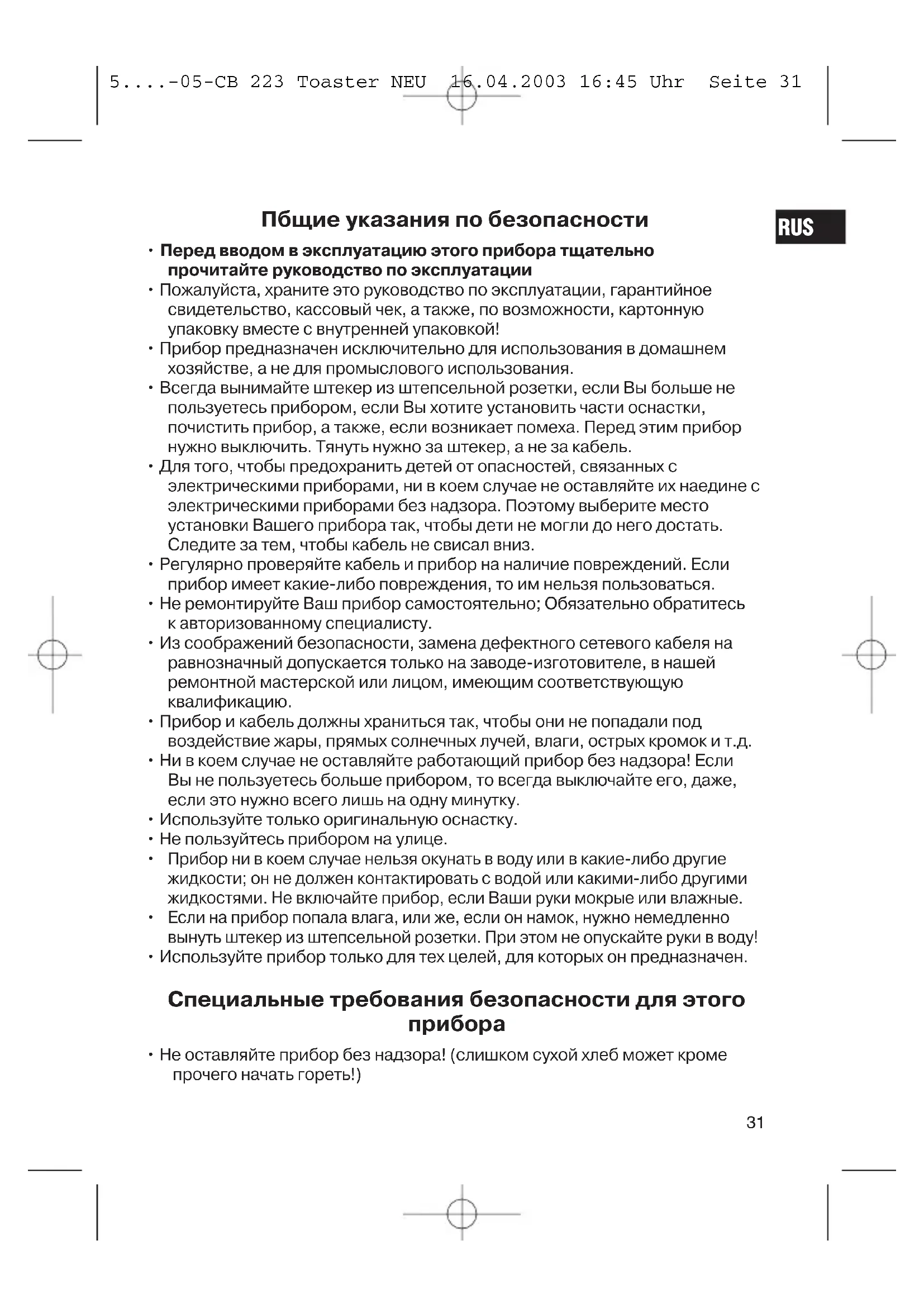 RUS 5....-05-CB 223 Toaster NEU 16.04.2003 16:45 Uhr Seite 31• Металлические части нагреваются. ОПАСНОСТЬ ОЖОГОВ! Прикасайтесь только к ручкам.