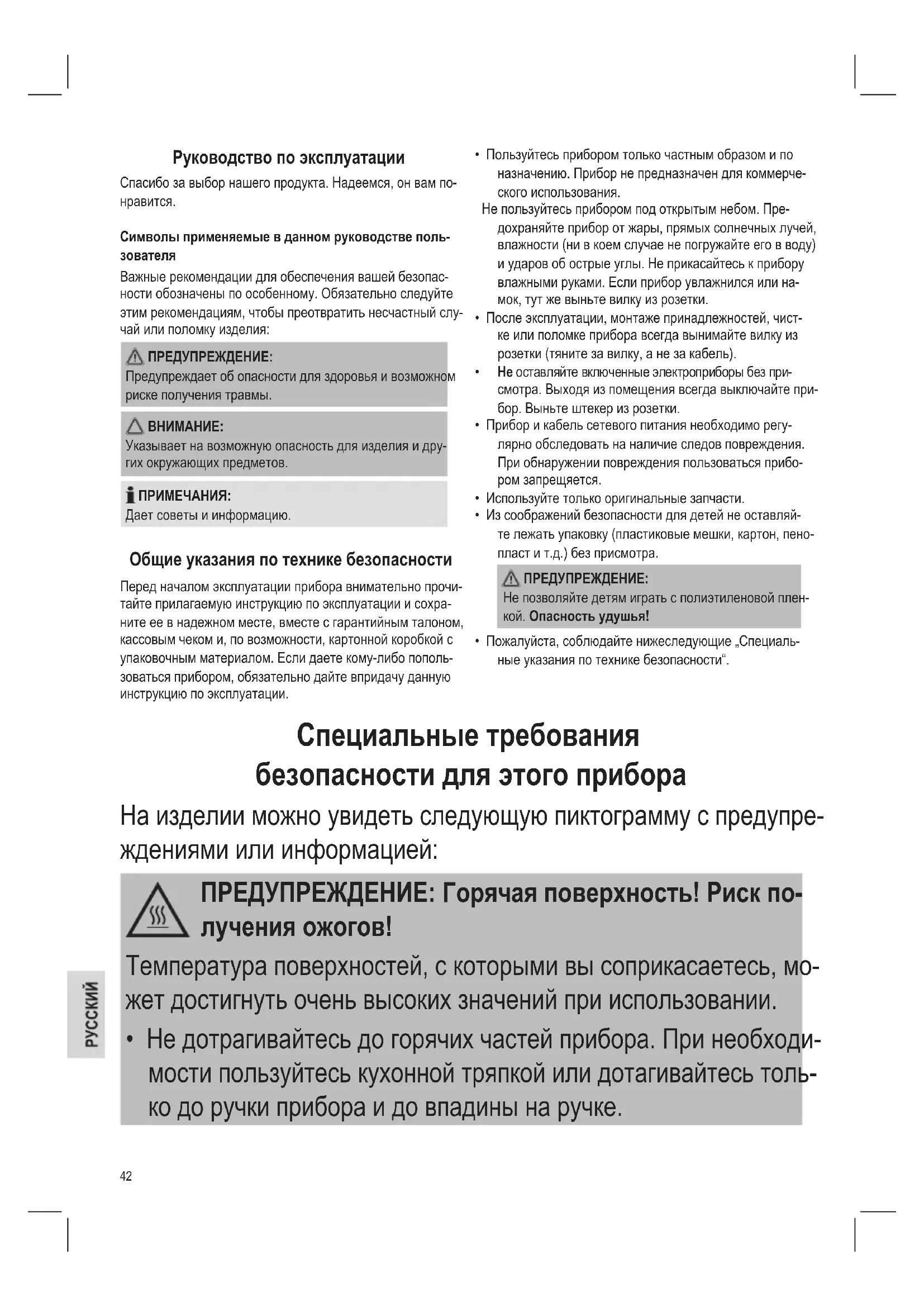 - Пожалуйста, соблюдайте нижеследующие „Специаль- ные указания по технике безопасности“. Специальные требования безопасности для этого прибора Нa издeлии можнo yвидeть cлeдyющyю пиктoгpaммy c пpeдyпpe- ждeниями или инфopмaциeй: ПРЕДУПРЕЖДЕНИЕ: Горячая поверхность! Риск по- лучения ожогов! Температура поверхностей, с которыми вы соприкасаетесь, мо- жет достигнуть очень высоких значений при использовании.