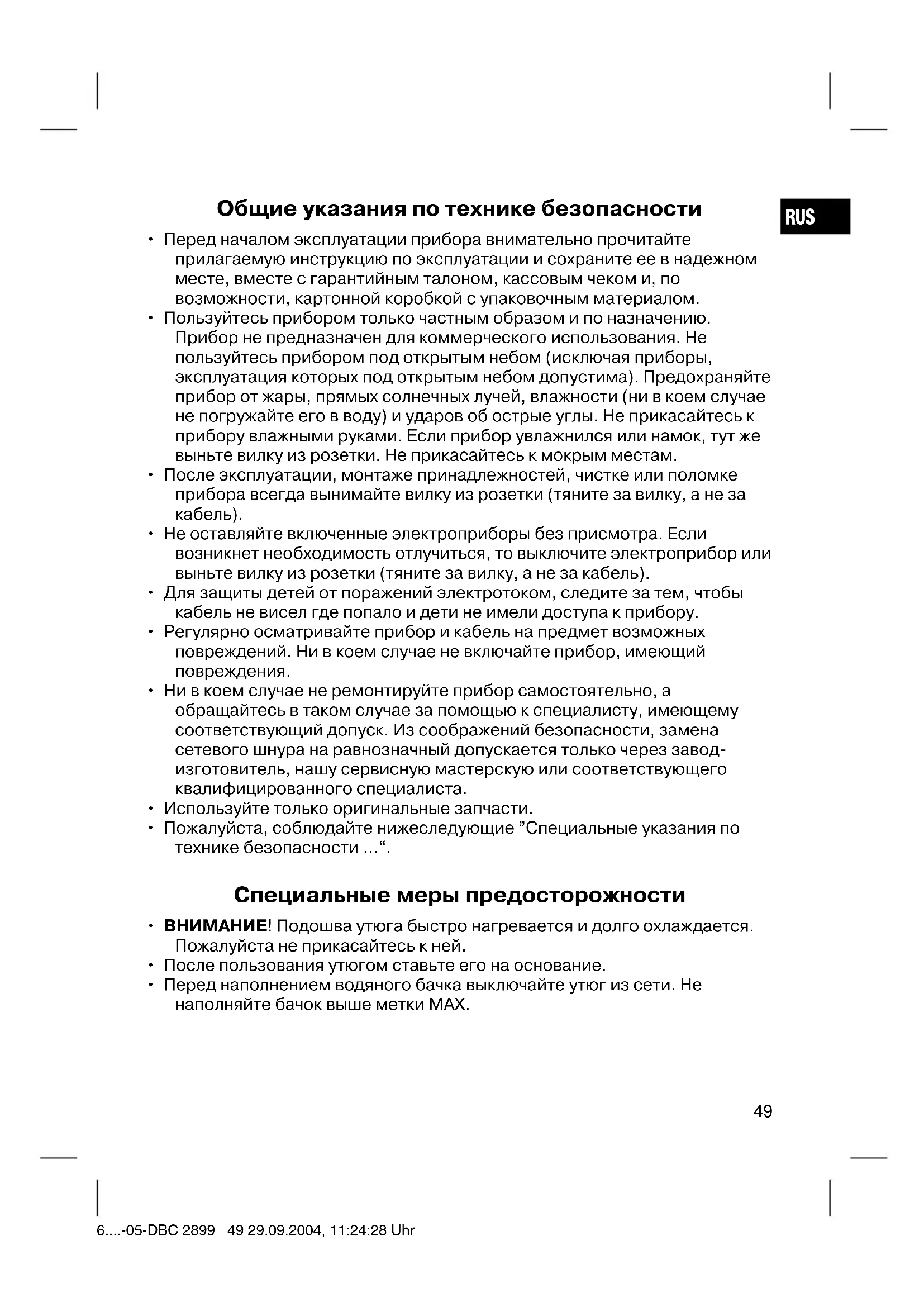 - Перед наполнением водяного бачка выключайте утюг из сети. Не наполняйте бачок выше метки MAX. 6....-05-DBC 2899 49 29.09.2004, 11:24:28 UhrRUS