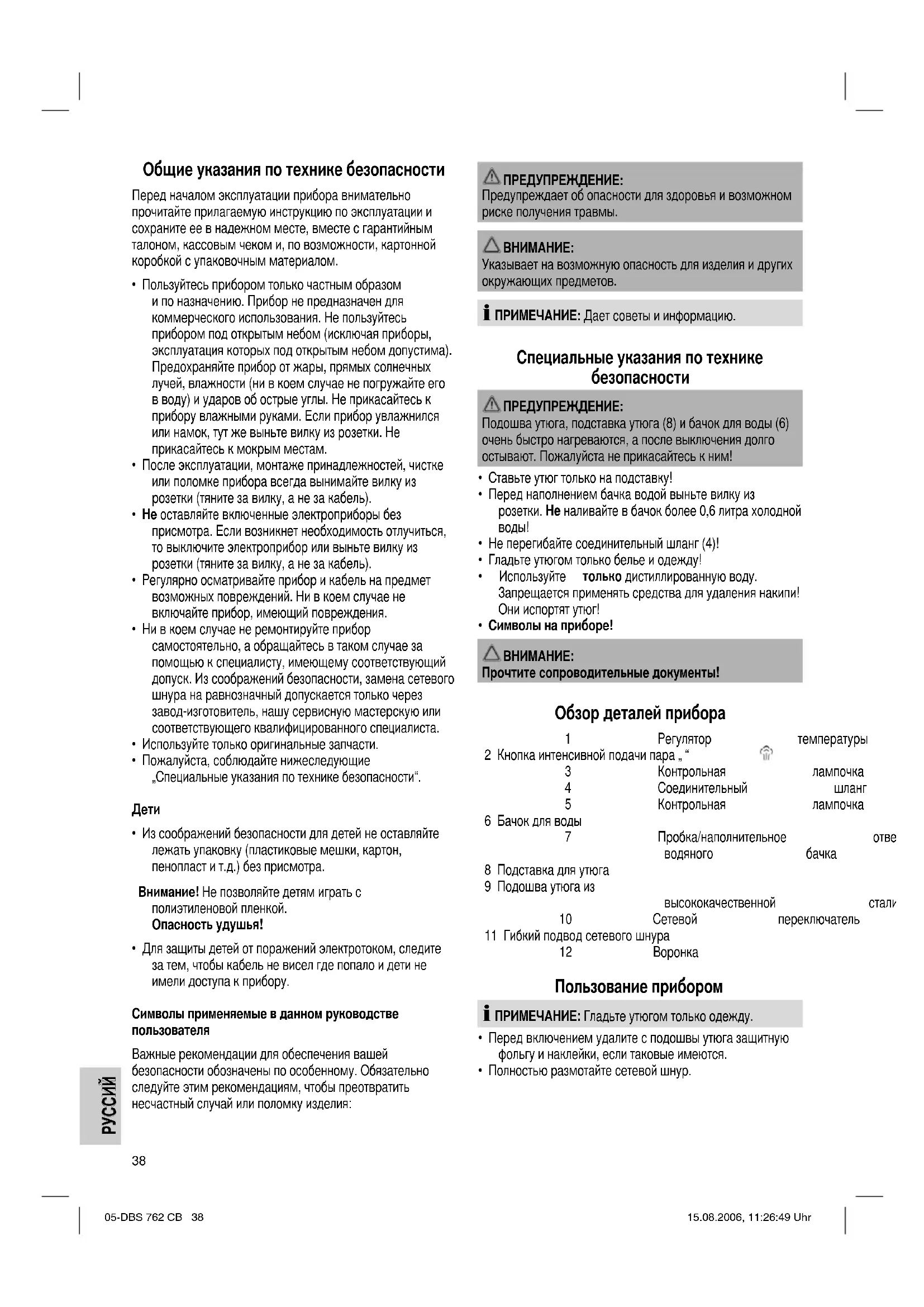 - Полностью размотайте сетевой шнур. 05-DBS 762 CB 38 15.08.2006, 11:26:49 UhrРУССИЙ
