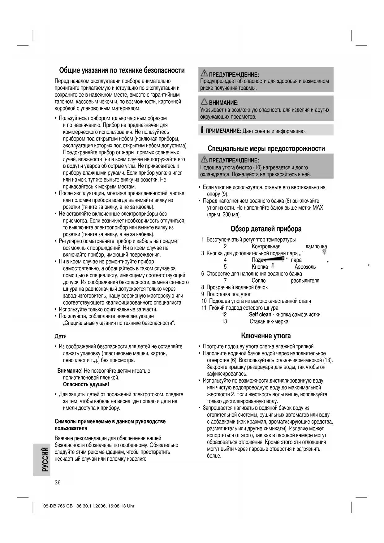 Указывает на возможную опасность для изделия и других окружающих предметов. ПРИМЕЧАНИЕ: Дает советы и информацию. Специальные меры предосторожности ПРЕДУПРЕЖДЕНИЕ: Подошва утюга быстро (10) нагревается и долго охлаждается. Пожалуйста не прикасайтесь к ней.