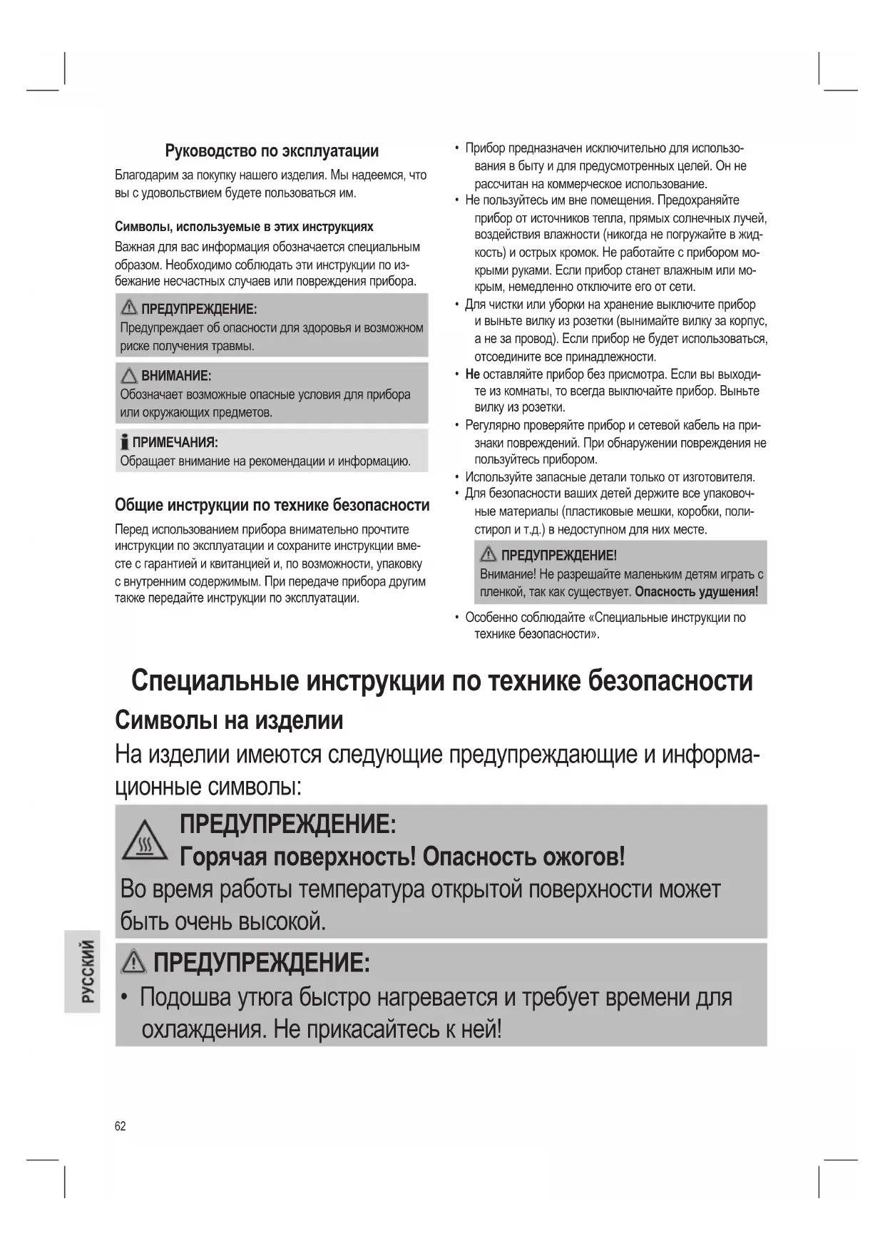 - Подошва утюга быстро нагревается и требует времени для охлаждения. Не прикасайтесь к ней!63 ПРЕДУПРЕЖДЕНИЕ: