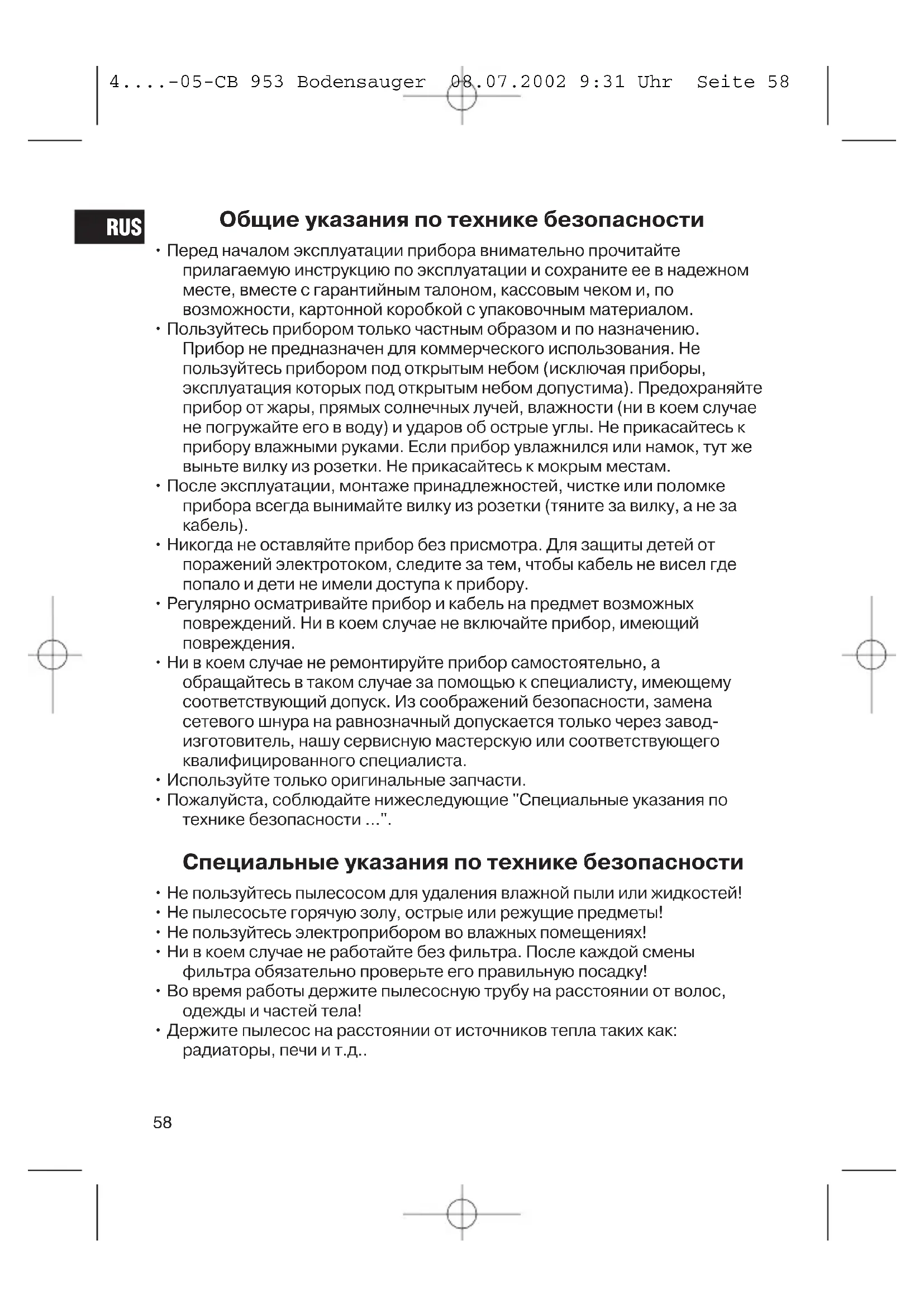 RUS 4....-05-CB 953 Bodensauger 08.07.2002 9:31 Uhr Seite 61Гарантийное обязательство Гарантийный срок на территории Российской Федерации устанавливается полномочными представителями. Кассовый чек является гарантийным талоном. Без него невозможен бесплатный ремонт или замена изделия. В случае возникновжния притензий по гарантии, предъявите изделие в полнойкомплектации, с оригинальной упаковкой и кассовым чеком торговой точке, продавшей это изделие. *) Дефекты принадлежностей не служат причиной для автоматической замены всего изделия. В этом случае позвоните нам, пожалуйста, по горячей линии! Разбитые стеклянные и поломаные пластмассовые детали возмещаются только за дополнительную оплату! Дефекты изнашиваемых принадлежностей или трущихся деталей (например контактные щетки моторов, смесительные крюки, приводные ремни, запасные пульты управления, запасные зубные щетки, пильные полотна и т.д.), а также чистка, техобслуживание или замена трущихся деталей не попадают под гарантию, и поэтому проводятся за отдельную оплату! Гарантия теряется при вскрытии изделия посторонними лицами. После гарантии После окончания срока гарантии, ремонт изделий производится за оплату, соответствующими мастерскими или пунктами сервисного обслуживания.