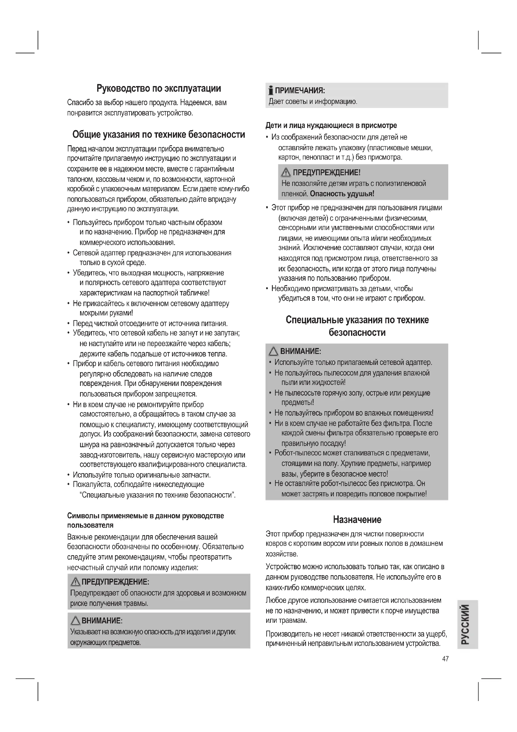 Можна віднести акумуляторну батарею до пункту прийому старих батарей або до спеціального контейнера. За відомостями зверніться до органів місцевої влади.47 Руководство по эксплуатации Спасибо за выбор нашего продукта. Надеемся, вам понравится эксплуатировать устройство. Общие указания по технике безопасности Перед началом эксплуатации прибора внимательно прочитайте прилагаемую инструкцию по эксплуатации и сохраните ее в надежном месте, вместе с гарантийным талоном, кассовым чеком и, по возможности, картонной коробкой с упаковочным материалом. Если даете кому-либо попользоваться прибором, обязательно дайте впридачу данную инструкцию по эксплуатации.