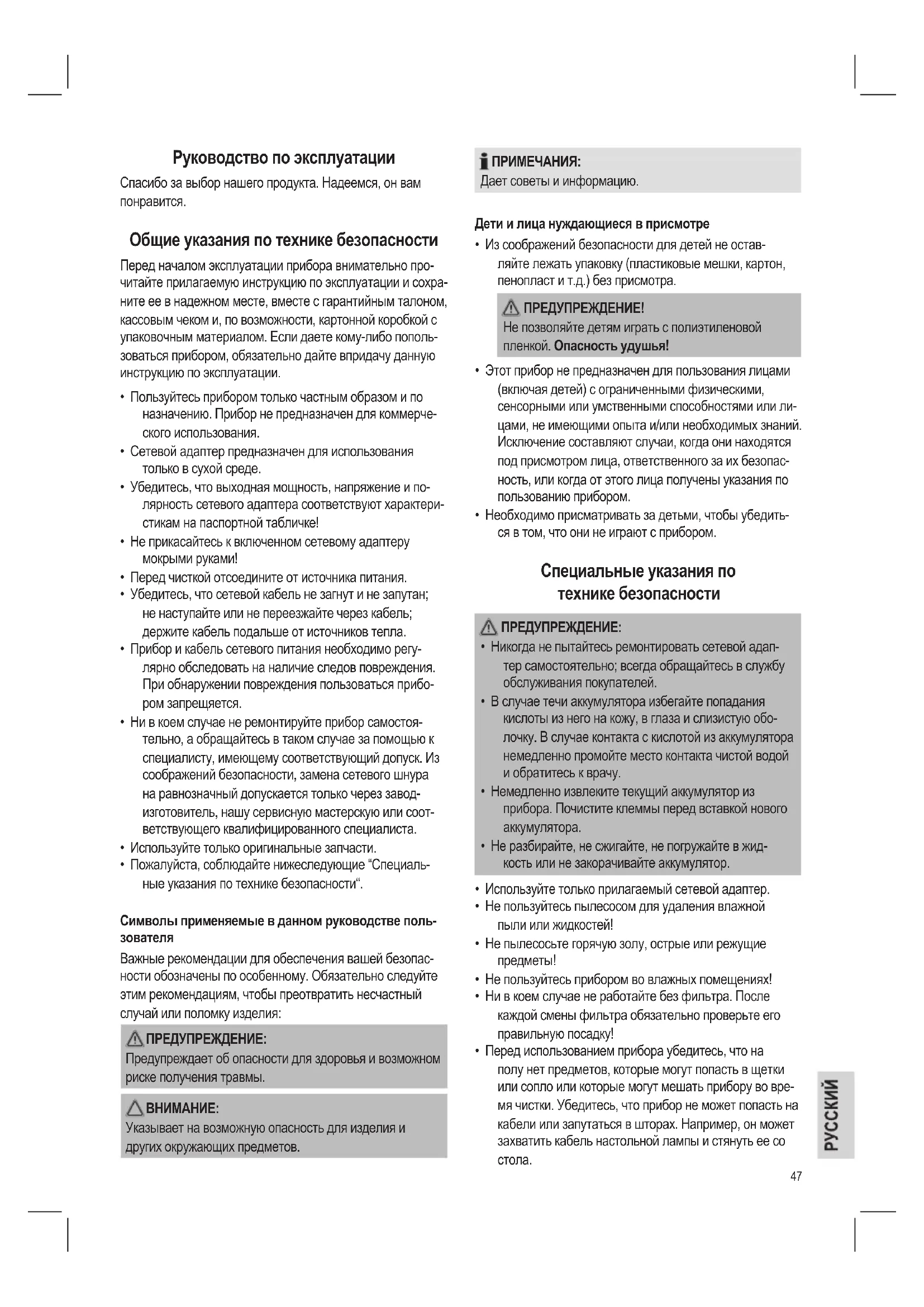 Заблокований отвір всмоктування. Почистіть отвір всмоктування. Повна ємність для пилу. Спорожніть ємність для пилу. Забруднений фільтр. Почистіть фільтр. Брудна тканинна насадка для підлоги. Почистіть або замініть тканинну насадку для під- логи.47 Руководство по эксплуатации Спасибо за выбор нашего продукта. Надеемся, он вам понравится. Общие указания по технике безопасности Перед началом эксплуатации прибора внимательно про- читайте прилагаемую инструкцию по эксплуатации и сохра- ните ее в надежном месте, вместе с гарантийным талоном, кассовым чеком и, по возможности, картонной коробкой с упаковочным материалом. Если даете кому-либо пополь- зоваться прибором, обязательно дайте впридачу данную инструкцию по эксплуатации.