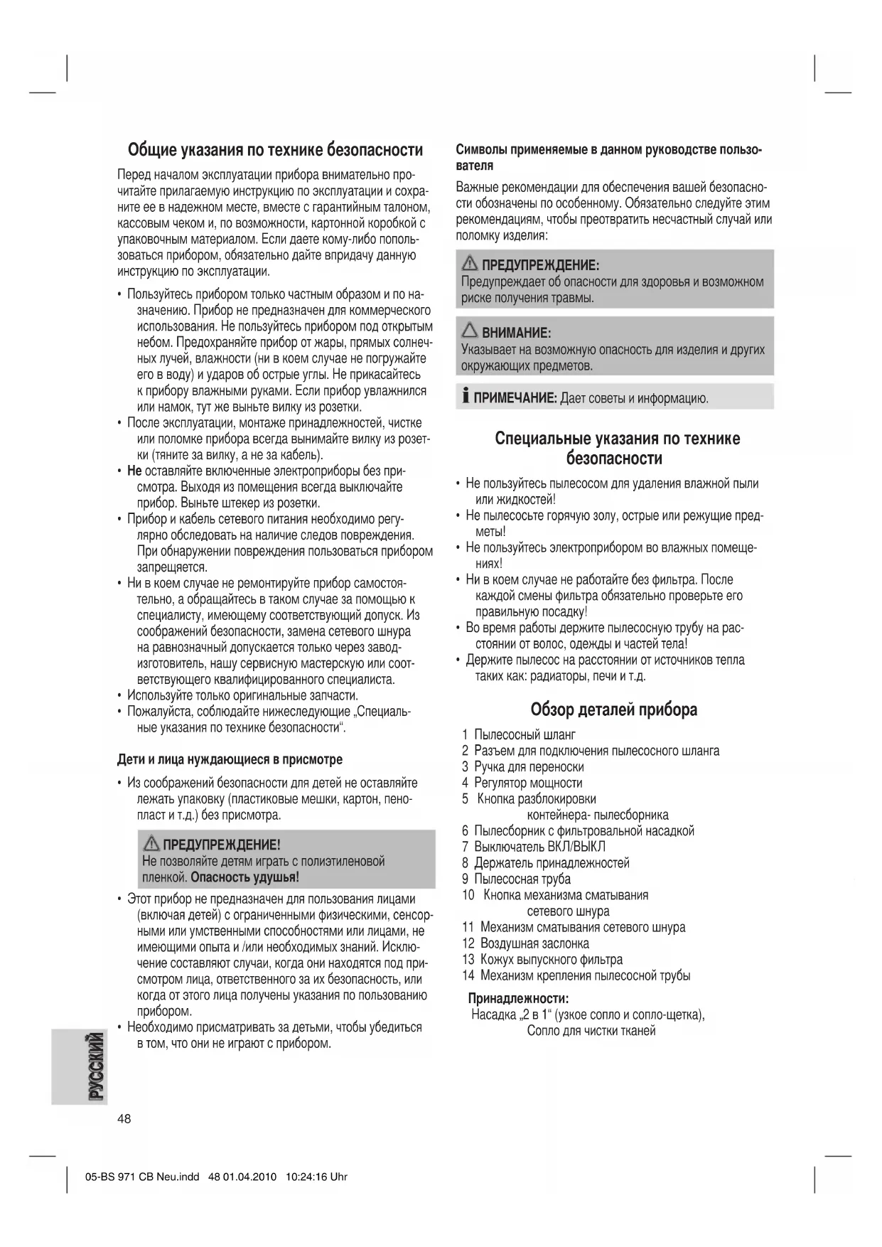 - Пожалуйста, соблюдайте нижеследующие „Специаль- ные указания по технике безопасности“. Дети и лица нуждающиеся в присмотре