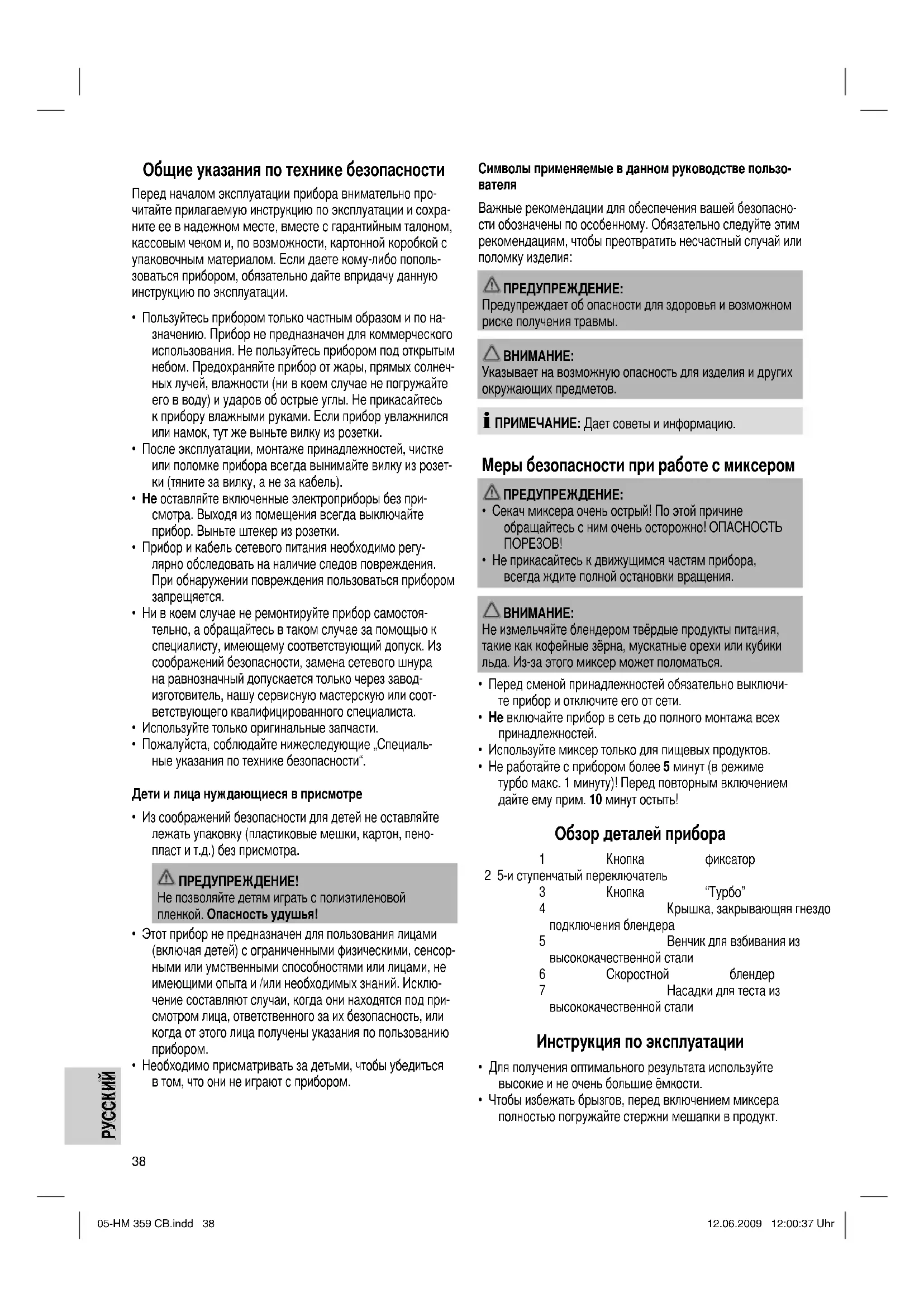 - Чтобы избежать брызгов, перед включением миксера полностью погружайте стержни мешалки в продукт. 05-HM 359 CB.indd 3805-HM 359 CB.indd 38 12.06.2009 12:00:37 Uhr12.06.2009 12:00:37 Uhr39