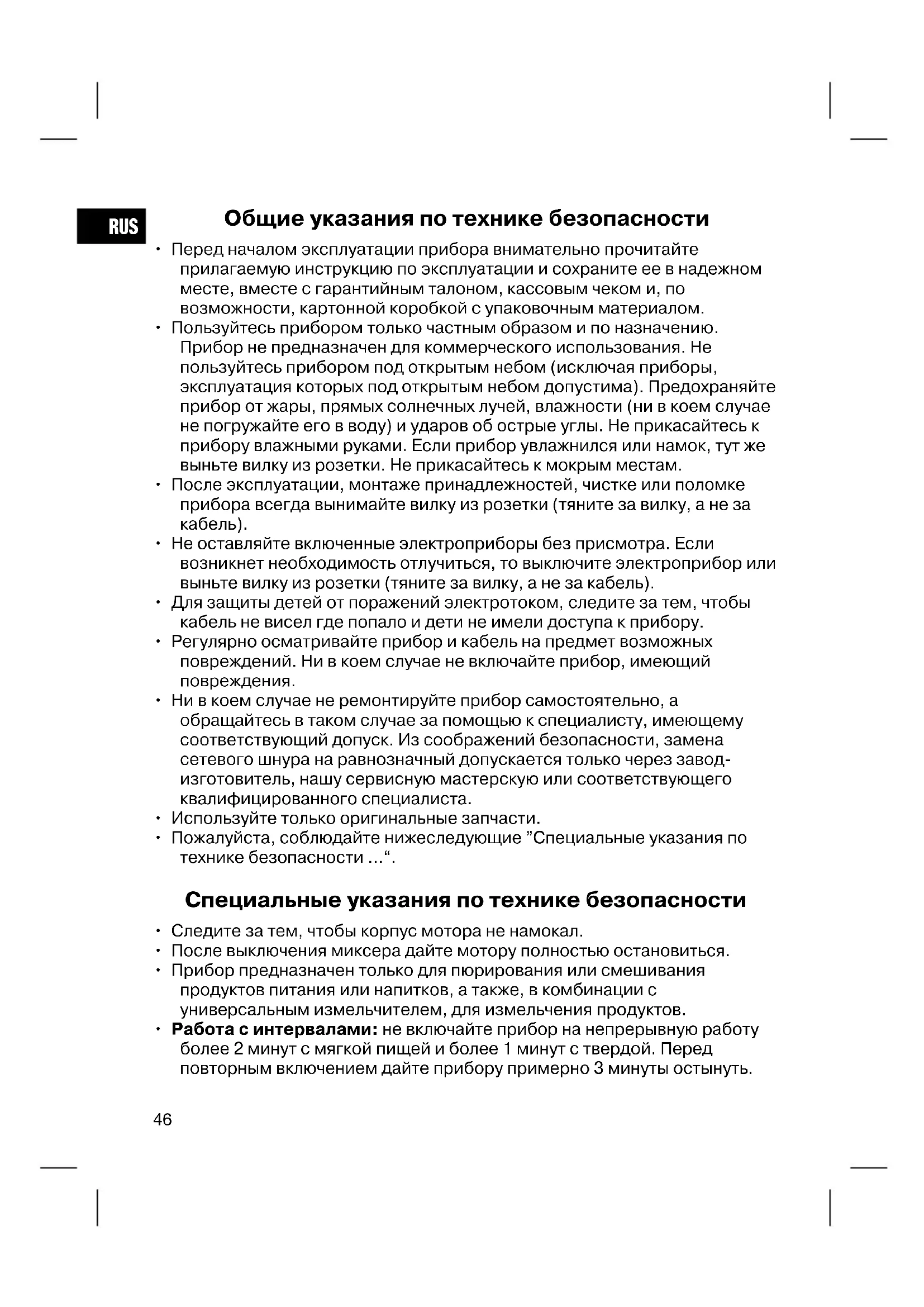 - Работа с интервалами: не включайте прибор на непрерывную работу более 2 минут с мягкой пищей и более 1 минут с твердой. Перед повторным включением дайте прибору примерно 3 минуты остынуть.RUS
