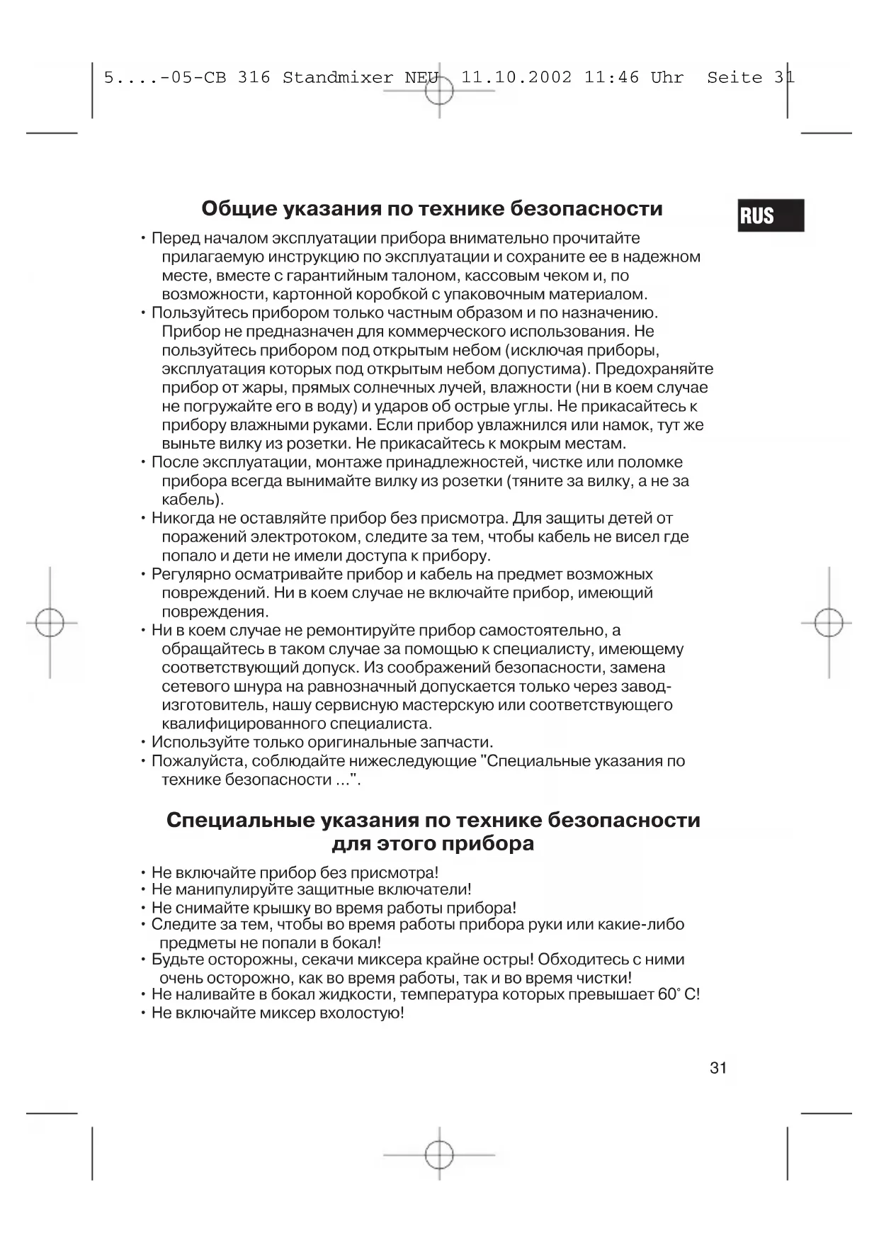 RUS 5....-05-CB 316 Standmixer NEU 11.10.2002 11:46 Uhr Seite 31• Не наполняйте бокал твердыми продуктами, как например кубики льда, мускатный орех или большие куски плиточного шоколада! Это может привести к поломке секача! Обзор деталей прибора