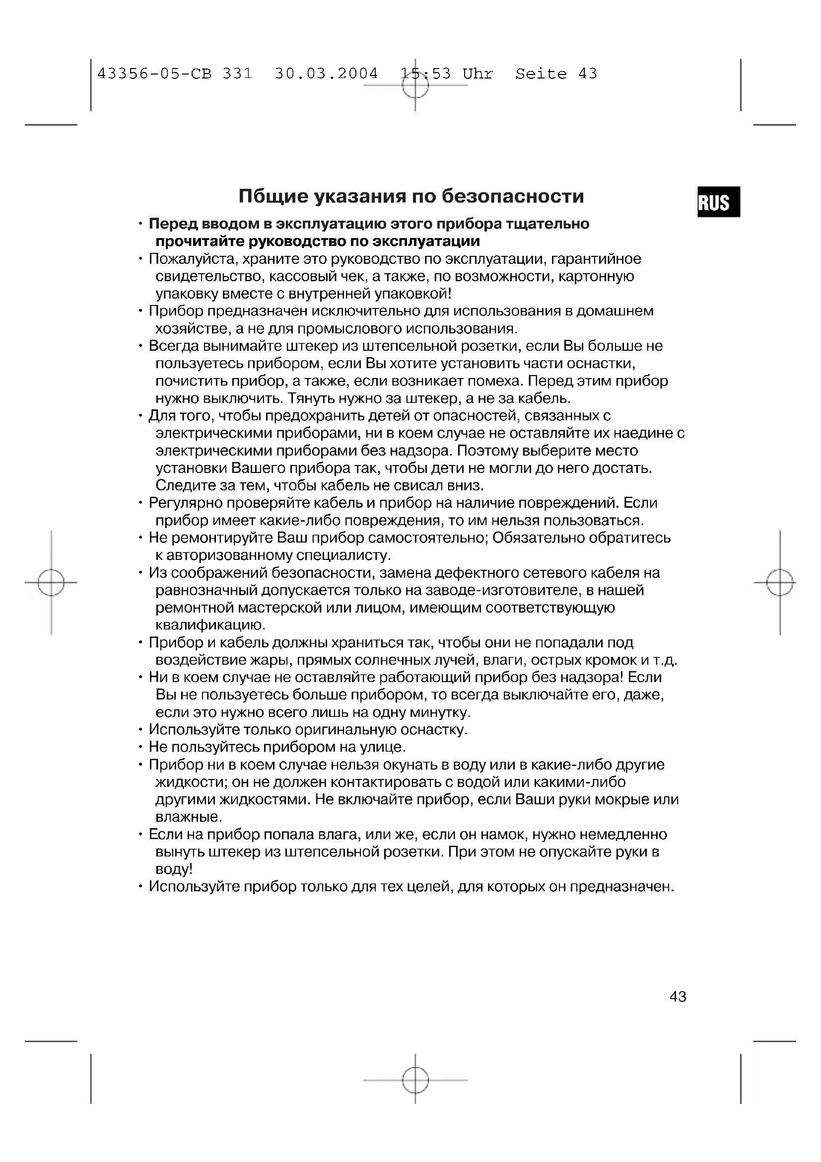 RUS 43356-05-CB 331 30.03.2004 15:53 Uhr Seite 43Специальные указания по технике безопасности