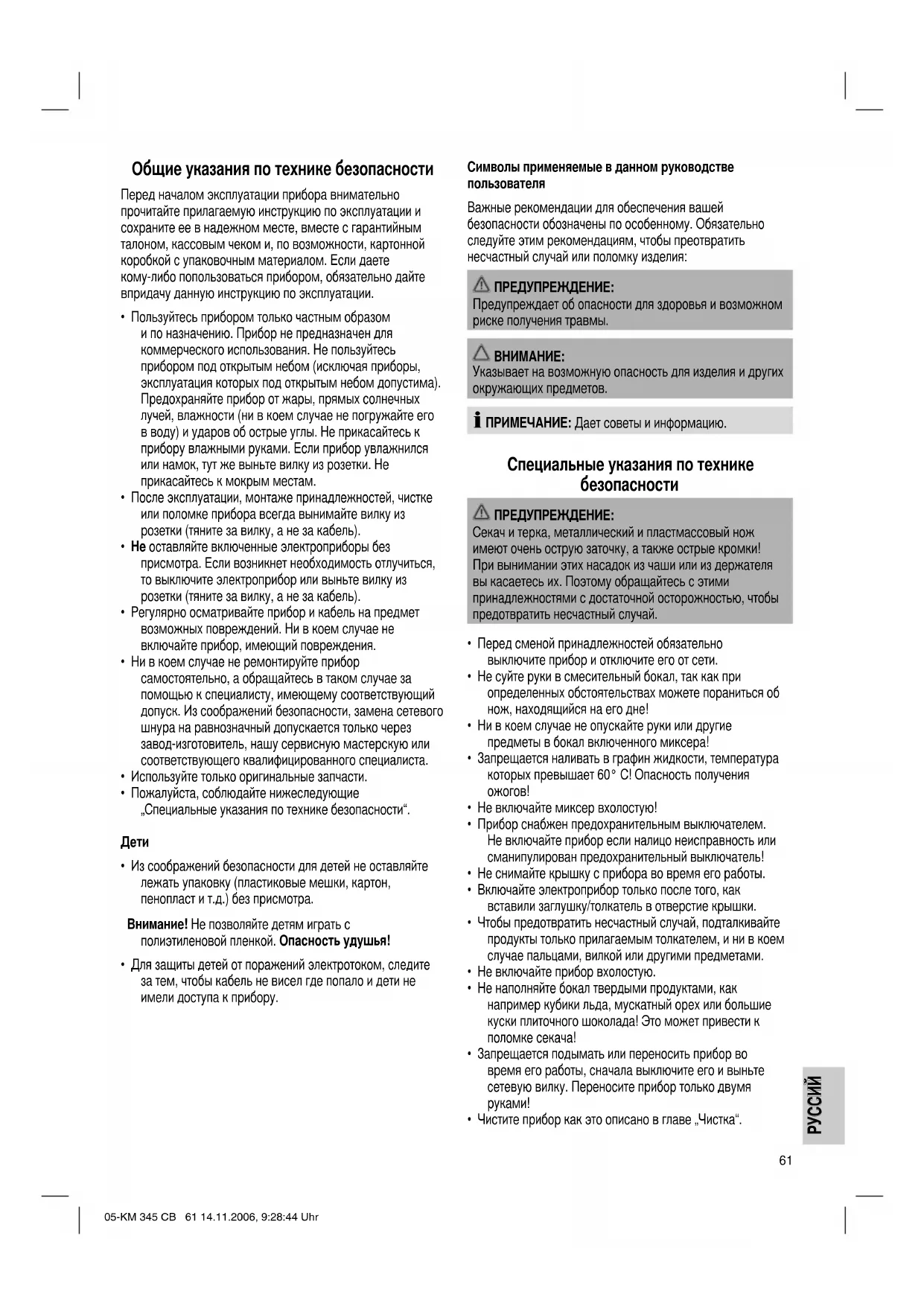 Указывает на возможную опасность для изделия и других окружающих предметов. ПРИМЕЧАНИЕ: Дает советы и информацию. Специальные указания по технике безопасности ПРЕДУПРЕЖДЕНИЕ: Секач и терка, металлический и пластмассовый нож имеют очень острую заточку, а также острые кромки! При вынимании этих насадок из чаши или из держателя вы касаетесь их. Поэтому обращайтесь с этими принадлежностями с достаточной осторожностью, чтобы предотвратить несчастный случай.