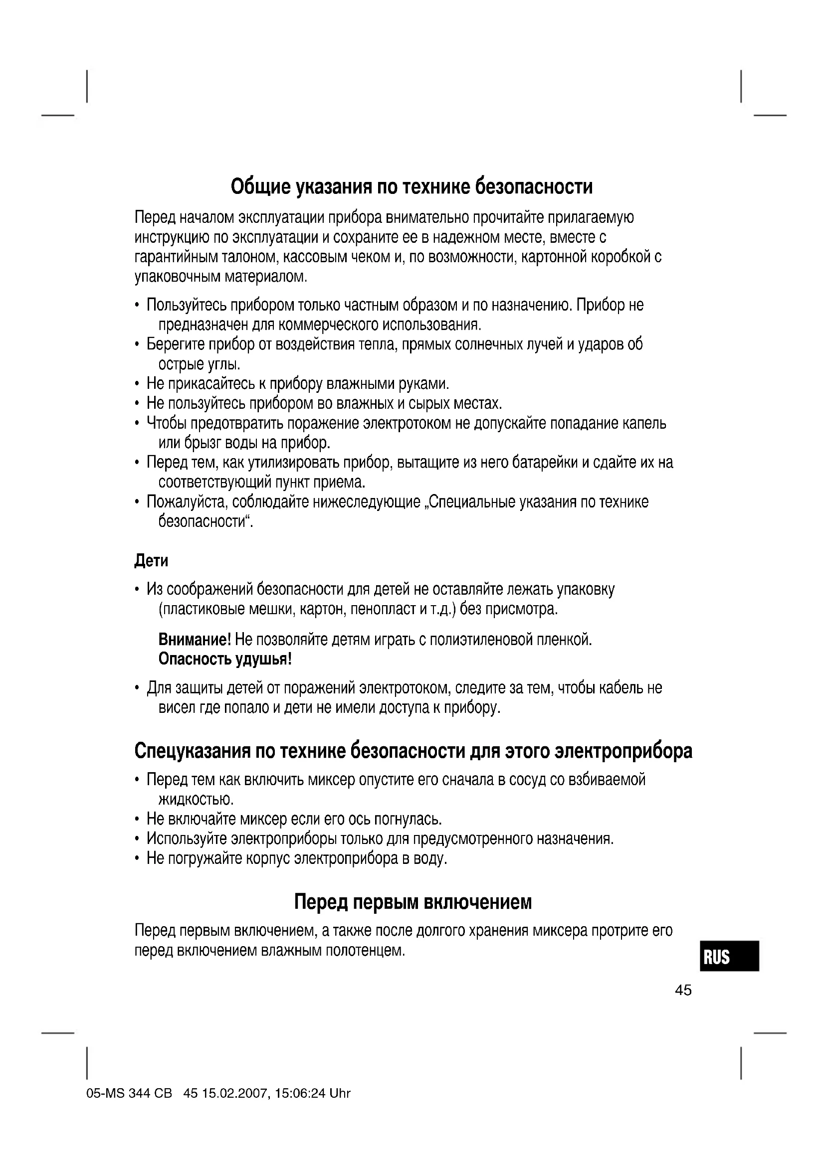 - Не погружайте корпус электроприбора в воду. Перед первым включением Перед первым включением, а также после долгого хранения миксера протрите его перед включением влажным полотенцем. 05-MS 344 CB 45 15.02.2007, 15:06:24 UhrRUS
