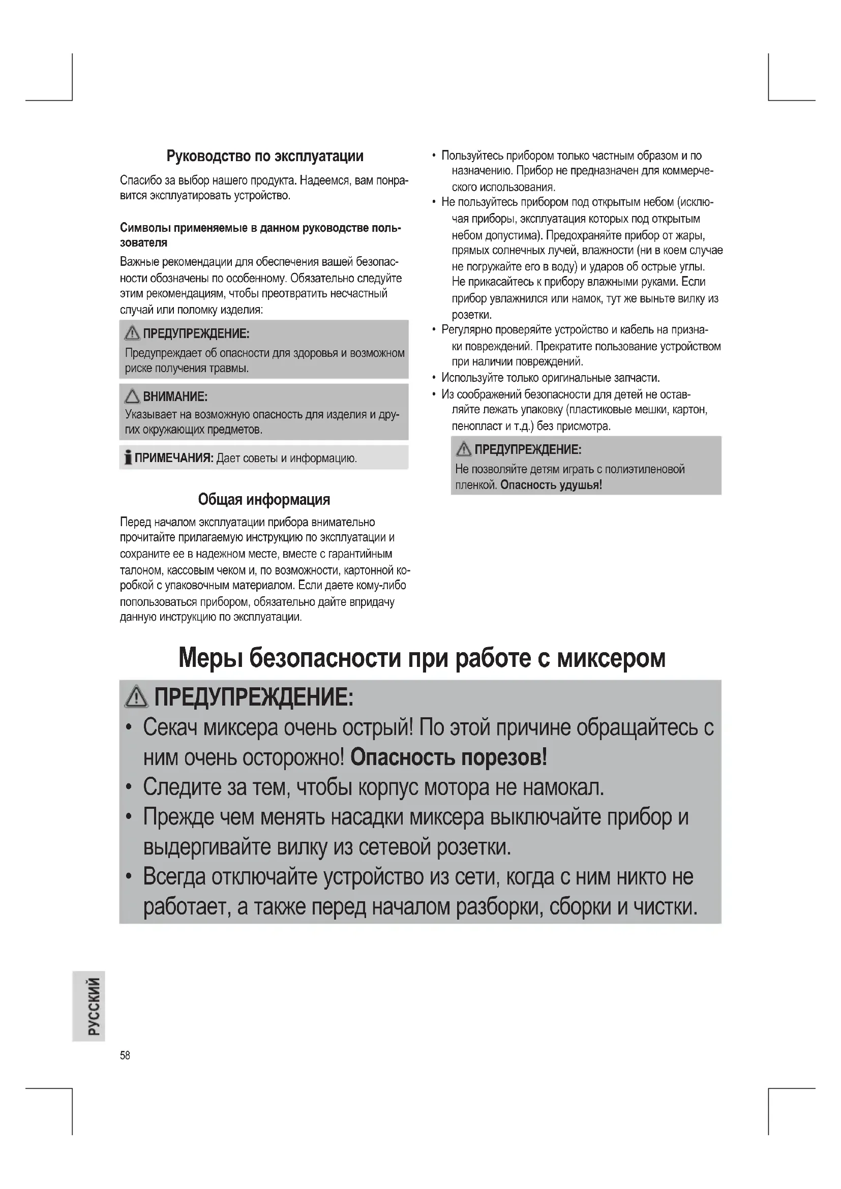 Указывает на возможную опасность для изделия и дру- гих окружающих предметов. ПРИМЕЧАНИЯ: Дает советы и информацию. Общая информация Перед началом эксплуатации прибора внимательно прочитайте прилагаемую инструкцию по эксплуатации и сохраните ее в надежном месте, вместе с гарантийным талоном, кассовым чеком и, по возможности, картонной ко- робкой с упаковочным материалом. Если даете кому-либо попользоваться прибором, обязательно дайте впридачу данную инструкцию по эксплуатации. Меры безопасности при работе с миксером ПРЕДУПРЕЖДЕНИЕ: