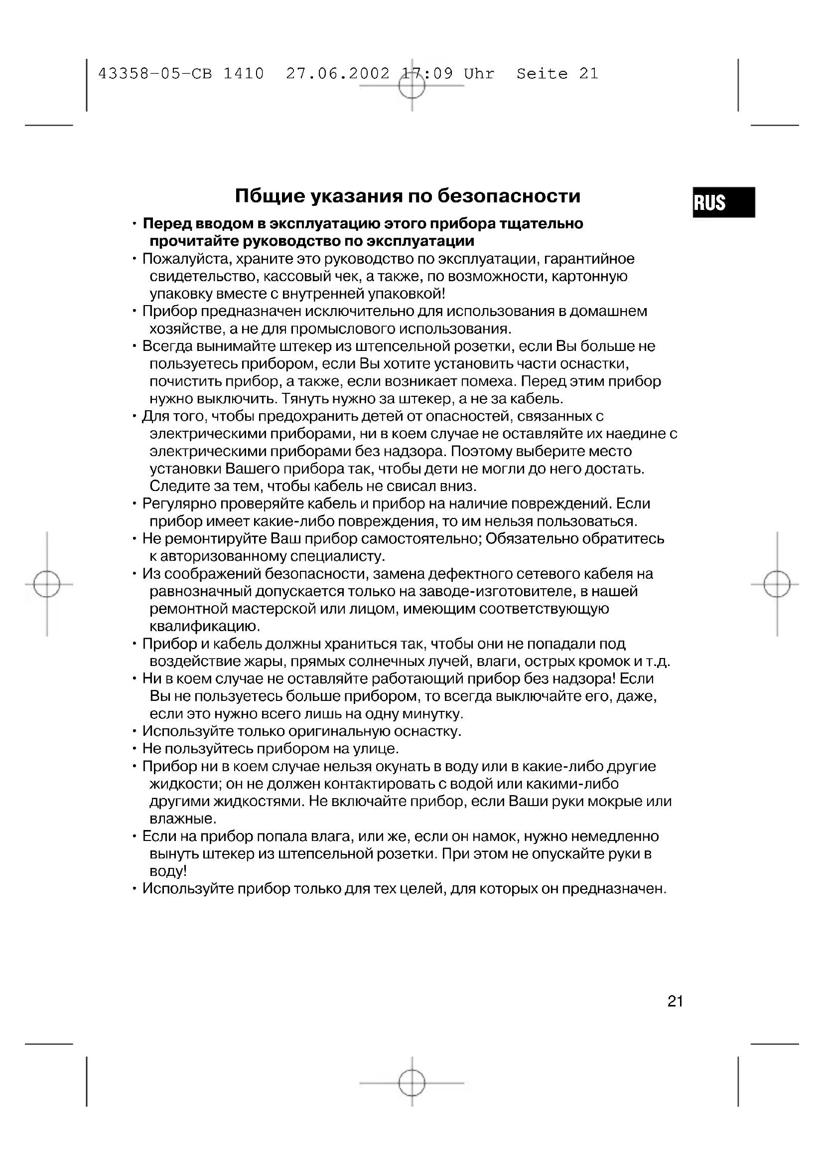 RUS 43358-05-CB 1410 27.06.2002 17:09 Uhr Seite 22Разбитое стекло или дефектные принадлежности не являются поводом для замены прибора, а будут бесплатно присланы взамен на дефектные. В таких случаях необходимо заказывать только дефектные принадлежности, а не посылать весь прибор на замену! Под гарантию не попадают: чистка, техосмотр или замена трущихся деталей прибора, они делаются за дополнительную оплату. Гарантия теряется при вскрытии прибора посторонними лицами. По окончании гарантии По истечении срока гарантии прибор можно сдать на ремонт в специализированный магазин или ремонтную мастерскую за оплату.