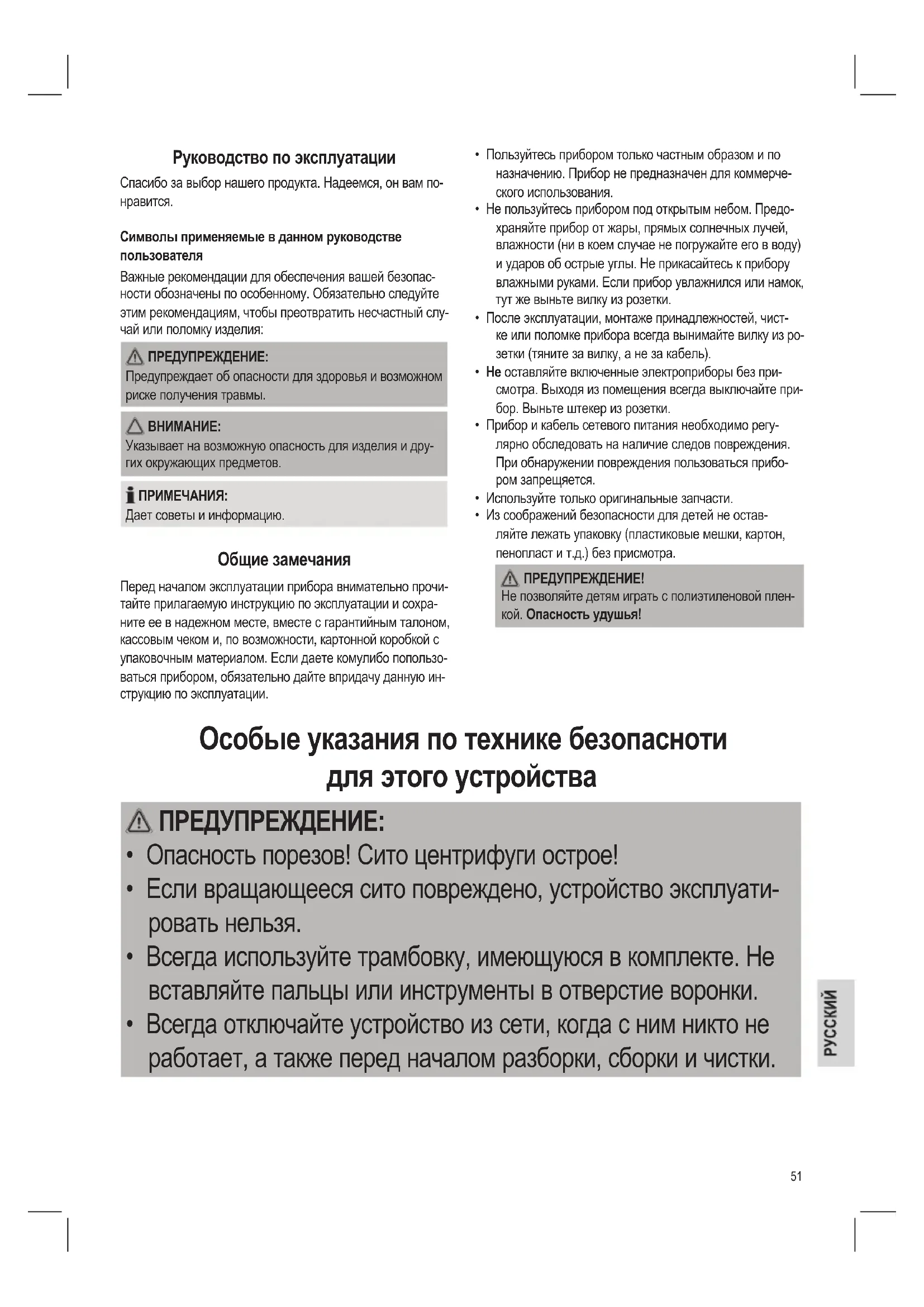Пищевые продукты, содержащие крахмал, такие как бана- ны, папайя, авокадо, инжир, манго, и особенно жесткие и волокнистые фрукты и овощи, не должны обрабатываться данным устройством. ПРЕДУПРЕЖДЕНИЕ: