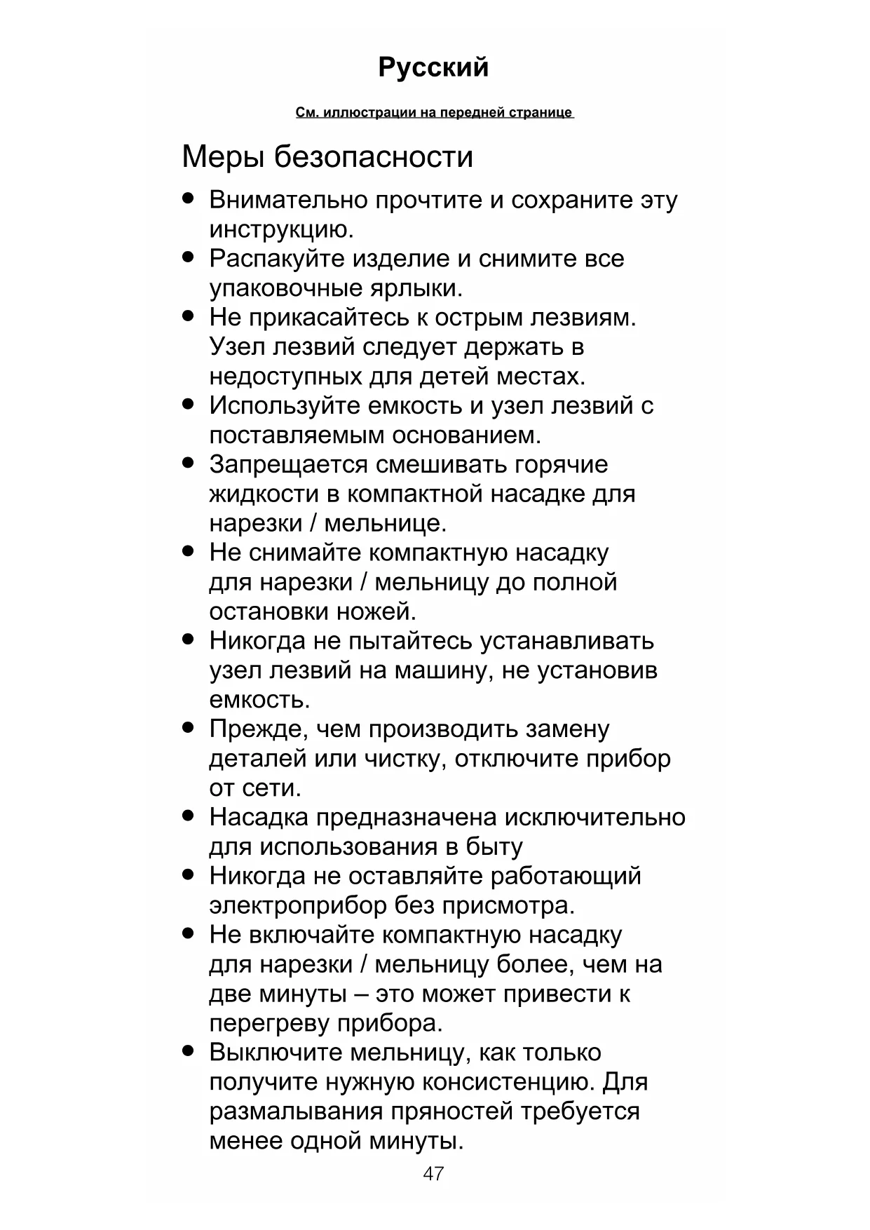Не снимайте компактную насадку для нарезки / мельницу до полной остановки ножей.