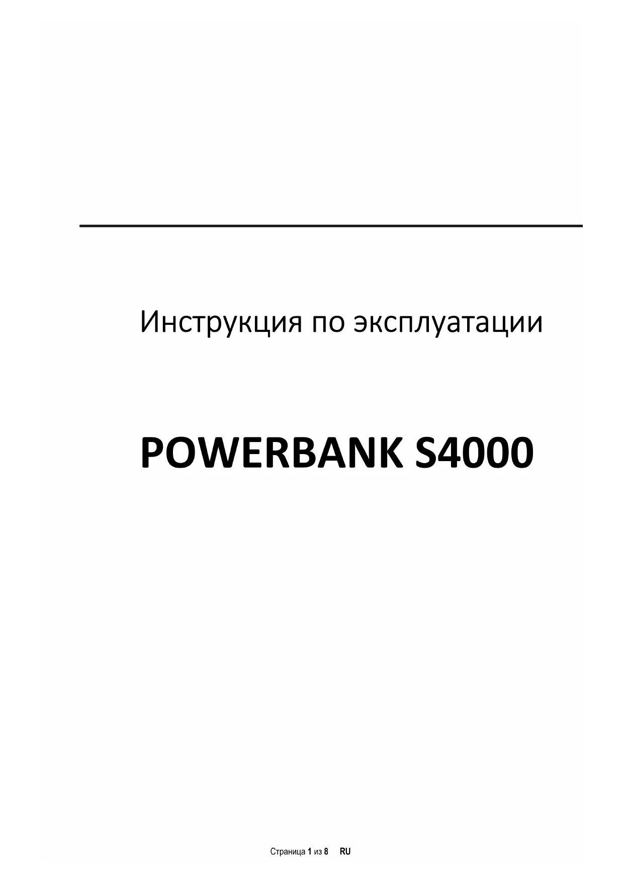 POWERBANK S4000Страница 2 из 8 RU О данном руководстве Внимательно прочитайте данное руководство и выполняйте все инструкции, указанные в нем для обеспечения длительного срока службы и надежного использования устройства. Пожалуйста, держите это руководство под рукой для дальнейшего использования и передайте его другим пользователям устройства. Использование по назначению Устройство Powerbank предназначено исключительно для электропитания устройств с рабочим напряжением 5В постоянного тока (мобильные телефоны, MP3-плееры, и др.). Иное использование или отличающееся использование считается использованием не по назначению и может привести к повреждениям и получению травм. Любые претензии относительно ущерба, вызванного использованием не по назначению, не принимаются. Чтобы избежать дисфункции не подключайте исходное соединение USB устройства к USB соединениям компьютеров на других устройствах. Они предназначены только для зарядки устройства. Не разбирайте устройство на отдельные части и не пытайтесь ремонтировать его. Устройство не имеет обслуживаемых пользователем деталей и в этом случае гарантия теряет силу. Не вставляйте в отверстия устройства предметы, не предназначенные для использования. Существует опасность короткого замыкания. Не трогайте и не берите устройство мокрыми руками. Не используйте воду или химические растворы для очищения устройства. Используйте только сухую ткань. То, что устройство нагревается во время использования, соответствует норме. Не накрывайте устройство во время использования. Не используйте устройство, если имеются видимые повреждения или в случае если оно мокрое. Инструкция по технике безопасности: Условия эксплуатации: Устройство эксплуатировать при температуре от 0 до 40 градусов Цельсия при относительной влажности воздуха макс. 90 %. Если Powerbank долгое время не используется, храните его при температуре от -10 и до 45 градусов Цельсия при относительной влажности воздуха макс. 90 % (короткое время) и заряжайте один раз в три месяца, чтобы поддерживать его работоспособность.Страница 3 из 8 RU Не используйте устройство в экстремально холодных, жарких, влажных или пыльных регионах или местах. Избегайте попадание на устройство прямых солнечных лучей. Избегать контакта с открытым пламенем. Опасность взрыва!
