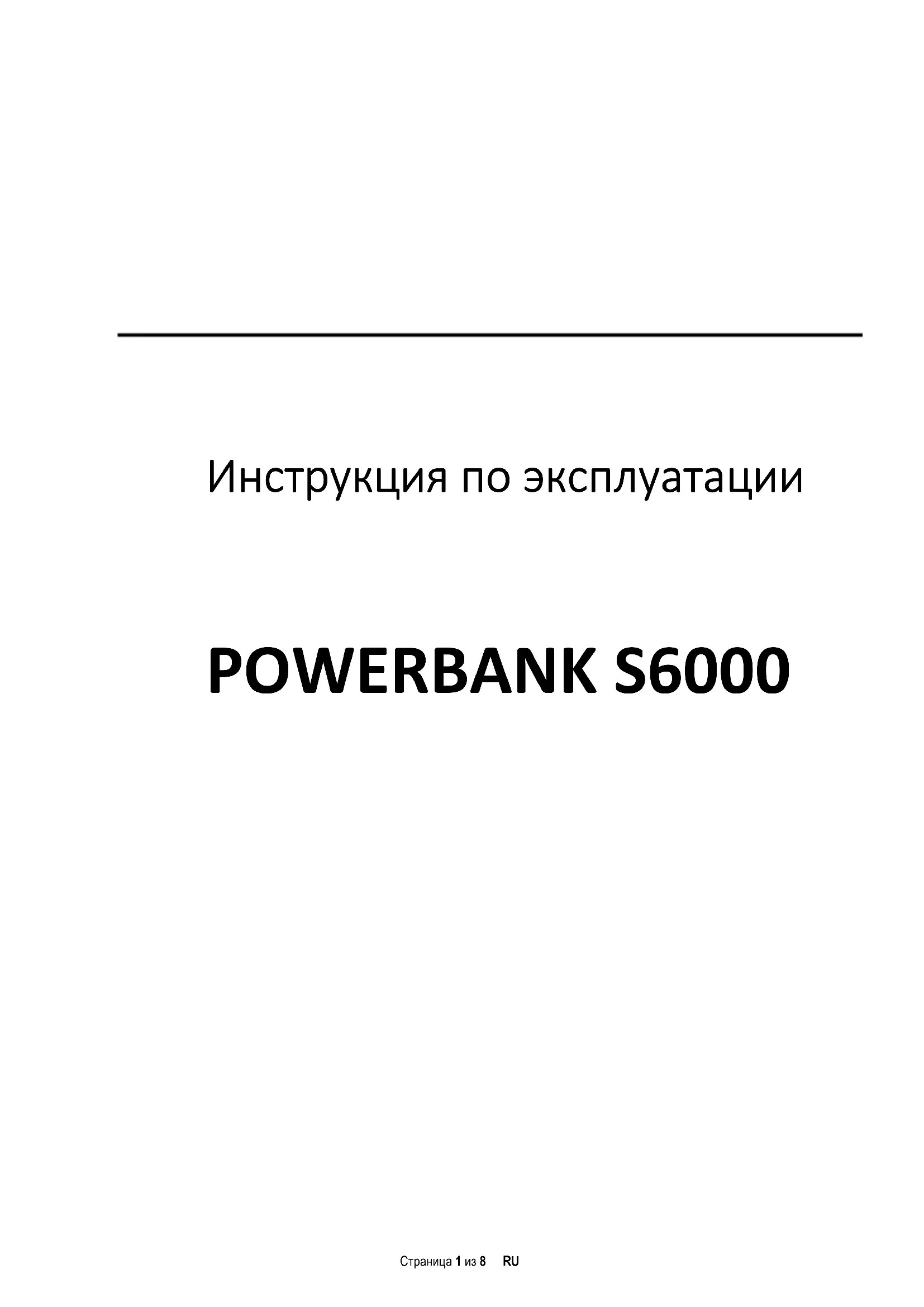 POWERBANK S6000Страница 2 из 8 RU О данном руководстве Внимательно прочитайте данное руководство и выполняйте все инструкции, указанные в нем для обеспечения длительного срока службы и надежного использования устройства. Пожалуйста, держите это руководство под рукой для дальнейшего использования и передайте его другим пользователям устройства. Использование по назначению Устройство Powerbank предназначено исключительно для электропитания устройств с рабочим напряжением 5В постоянного тока (мобильные телефоны, MP3-плееры, и др.). Иное использование или отличающееся использование считается использованием не по назначению и может привести к повреждениям и получению травм. Любые претензии относительно ущерба, вызванного использованием не по назначению, не принимаются. Чтобы избежать дисфункции не подключайте исходное соединение USB устройства к USB соединениям компьютеров на других устройствах. Они предназначены только для зарядки устройства. Не разбирайте устройство на отдельные части и не пытайтесь ремонтировать его. Устройство не имеет обслуживаемых пользователем деталей и в этом случае гарантия теряет силу. Не вставляйте в отверстия устройства предметы, не предназначенные для использования. Существует опасность короткого замыкания. Не трогайте и не берите устройство мокрыми руками. Не используйте воду или химические растворы для очищения устройства. Используйте только сухую ткань. То, что устройство нагревается во время использования, соответствует норме. Не накрывайте устройство во время использования. Не используйте устройство, если имеются видимые повреждения или в случае если оно мокрое. Инструкция по технике безопасности: Условия эксплуатации: Устройство эксплуатировать при температуре от 0 до 40 градусов Цельсия при относительной влажности воздуха макс. 90 %. Если Powerbank долгое время не используется, храните его при температуре от -10 и до 45 градусов Цельсия при относительной влажности воздуха макс. 90 % (короткое время) и заряжайте один раз в три месяца, чтобы поддерживать его работоспособность.Страница 3 из 8 RU Не используйте устройство в экстремально холодных, жарких, влажных или пыльных регионах или местах. Избегайте попадание на устройство прямых солнечных лучей. Избегать контакта с открытым пламенем. Опасность взрыва!