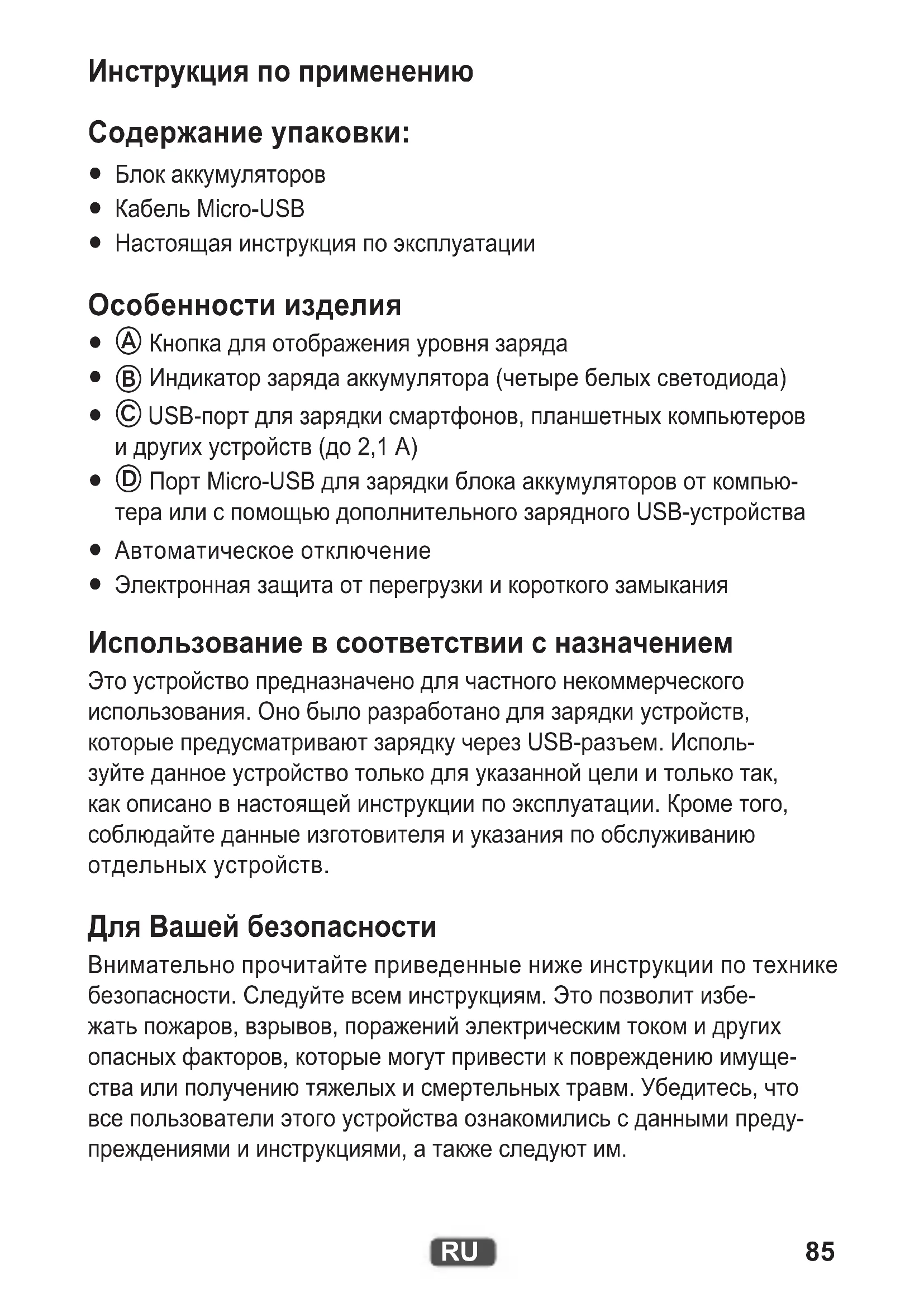 Электронная защита от перегрузки и короткого замыкания Использование в соответствии с назначением Это устройство предназначено для частного некоммерческого использования. Оно было разработано для зарядки устройств, которые предусматривают зарядку через USB-разъем. Исполь- зуйте данное устройство только для указанной цели и только так, как описано в настоящей инструкции по эксплуатации. Кроме того, соблюдайте данные изготовителя и указания по обслуживанию отдельных устройств. Для Вашей безопасности Внимательно прочитайте приведенные ниже инструкции по технике безопасности. Следуйте всем инструкциям. Это позволит избе- жать пожаров, взрывов, поражений электрическим током и других опасных факторов, которые могут привести к повреждению имуще- ства или получению тяжелых и смертельных травм. Убедитесь, что все пользователи этого устройства ознакомились с данными преду- преждениями и инструкциями, а также следуют им.86