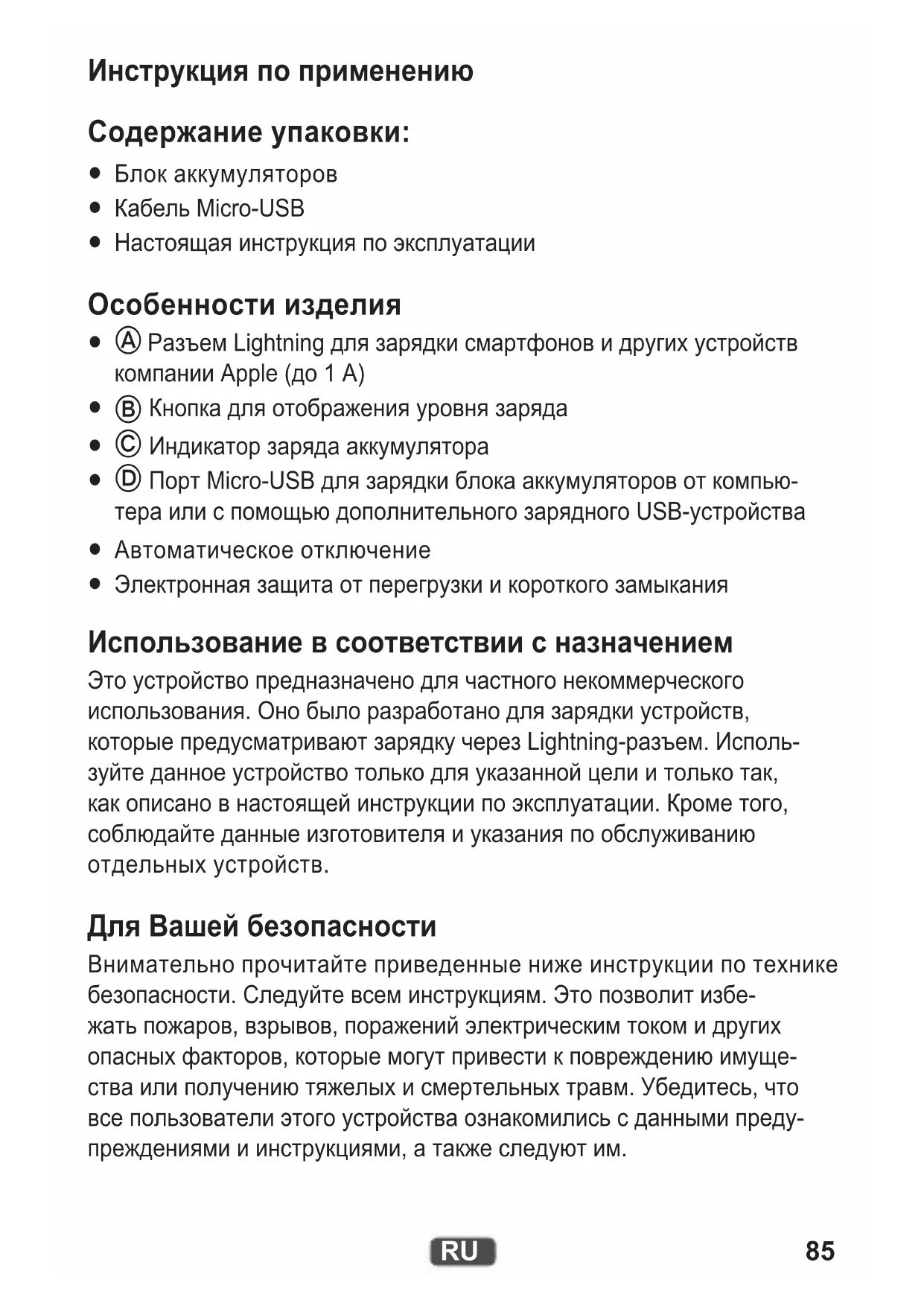 Электронная защита от перегрузки и короткого замыкания Использование в соответствии с назначением Это устройство предназначено для частного некоммерческого использования. Оно было разработано для зарядки устройств, которые предусматривают зарядку через Lightning-разъем. Исполь- зуйте данное устройство только для указанной цели и только так, как описано в настоящей инструкции по эксплуатации. Кроме того, соблюдайте данные изготовителя и указания по обслуживанию отдельных устройств. Для Вашей безопасности Внимательно прочитайте приведенные ниже инструкции по технике безопасности. Следуйте всем инструкциям. Это позволит избе- жать пожаров, взрывов, поражений электрическим током и других опасных факторов, которые могут привести к повреждению имуще- ства или получению тяжелых и смертельных травм. Убедитесь, что все пользователи этого устройства ознакомились с данными преду- преждениями и инструкциями, а также следуют им.86