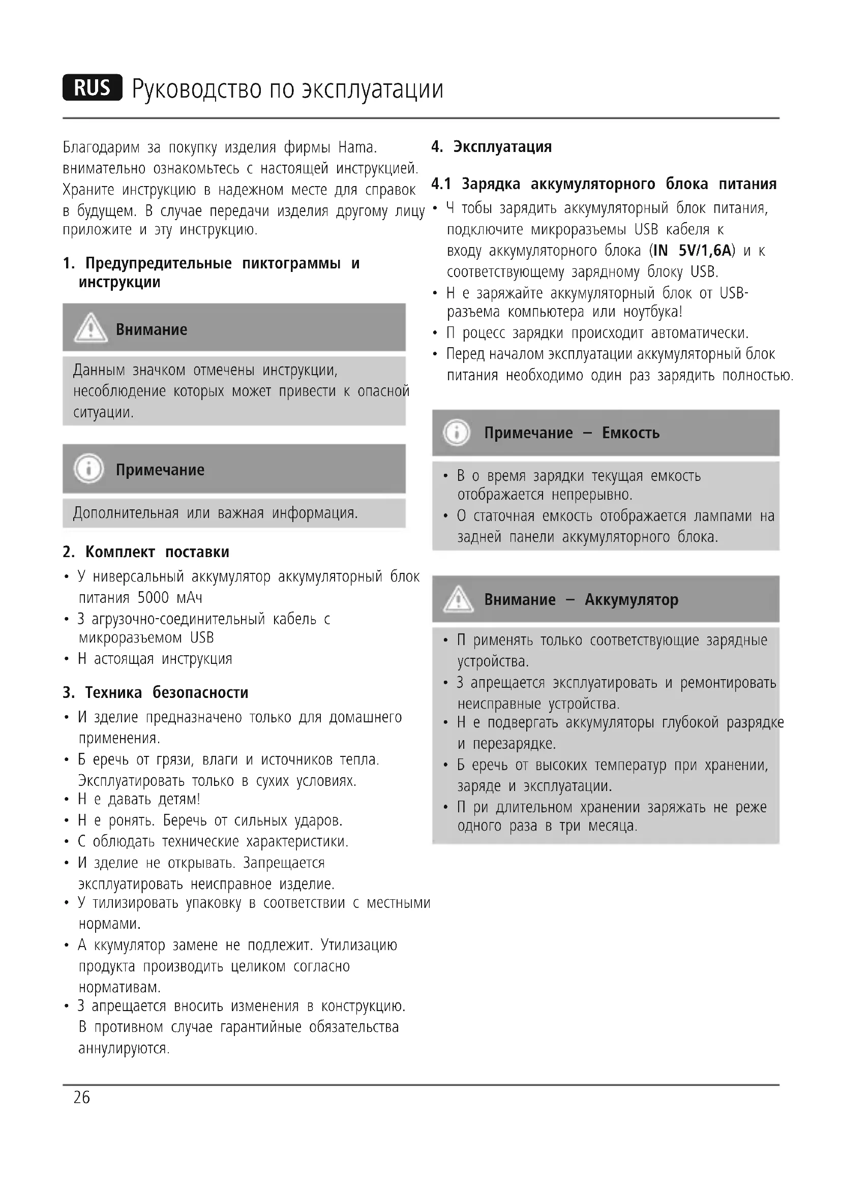 РУКОВОДСТВО ПОЛЬЗОВАТЕЛЯ Power Pack 00128076 HAMA