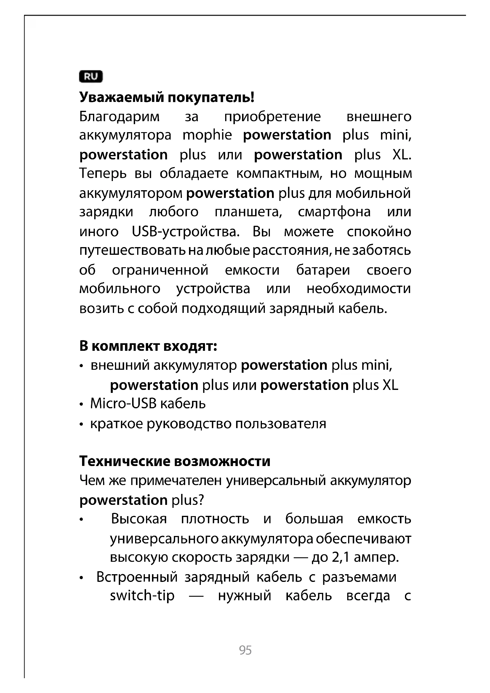 Благодарим за приобретение внешнего аккумулятора mophie powerstation plus mini, powerstation plus или powerstation plus XL. Теперь вы обладаете компактным, но мощным аккумулятором powerstation plus для мобильной зарядки любого планшета, смартфона или иного USB-устройства. Вы можете спокойно путешествовать на любые расстояния, не заботясь об ограниченной емкости батареи своего мобильного устройства или необходимости возить с собой подходящий зарядный кабель.