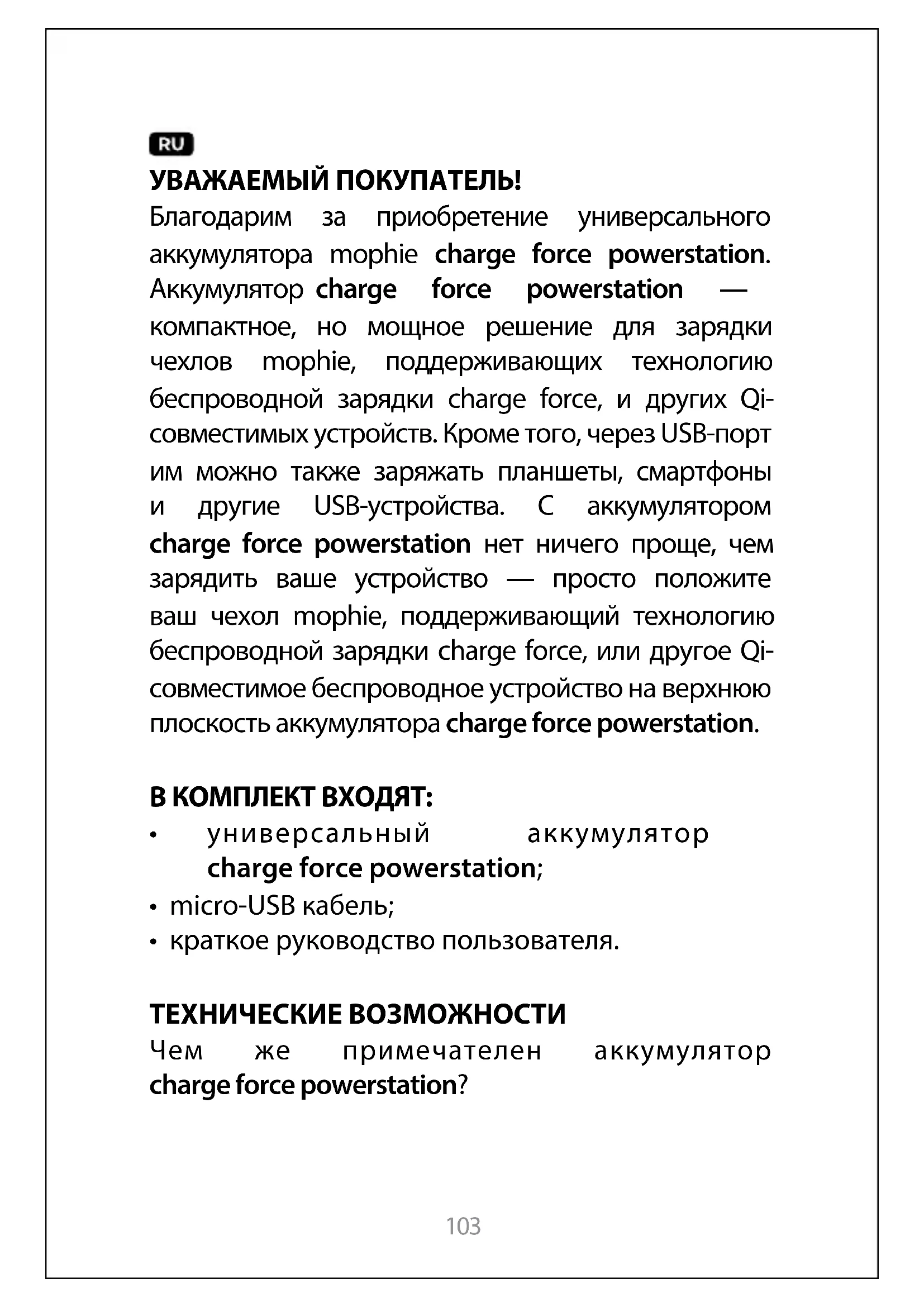 Благодарим за приобретение универсального аккумулятора mophie charge force powerstation. Аккумулятор charge force powerstation — компактное, но мощное решение для зарядки чехлов mophie, поддерживающих технологию беспроводной зарядки charge force, и других Qi-совместимых устройств. Кроме того, через USB-порт им можно также заряжать планшеты, смартфоны и другие USB-устройства. С аккумулятором charge force powerstation нет ничего проще, чем зарядить ваше устройство — просто положите ваш чехол mophie, поддерживающий технологию беспроводной зарядки charge force, или другое Qi-совместимое беспроводное устройство на верхнюю плоскость аккумулятора charge force powerstation.