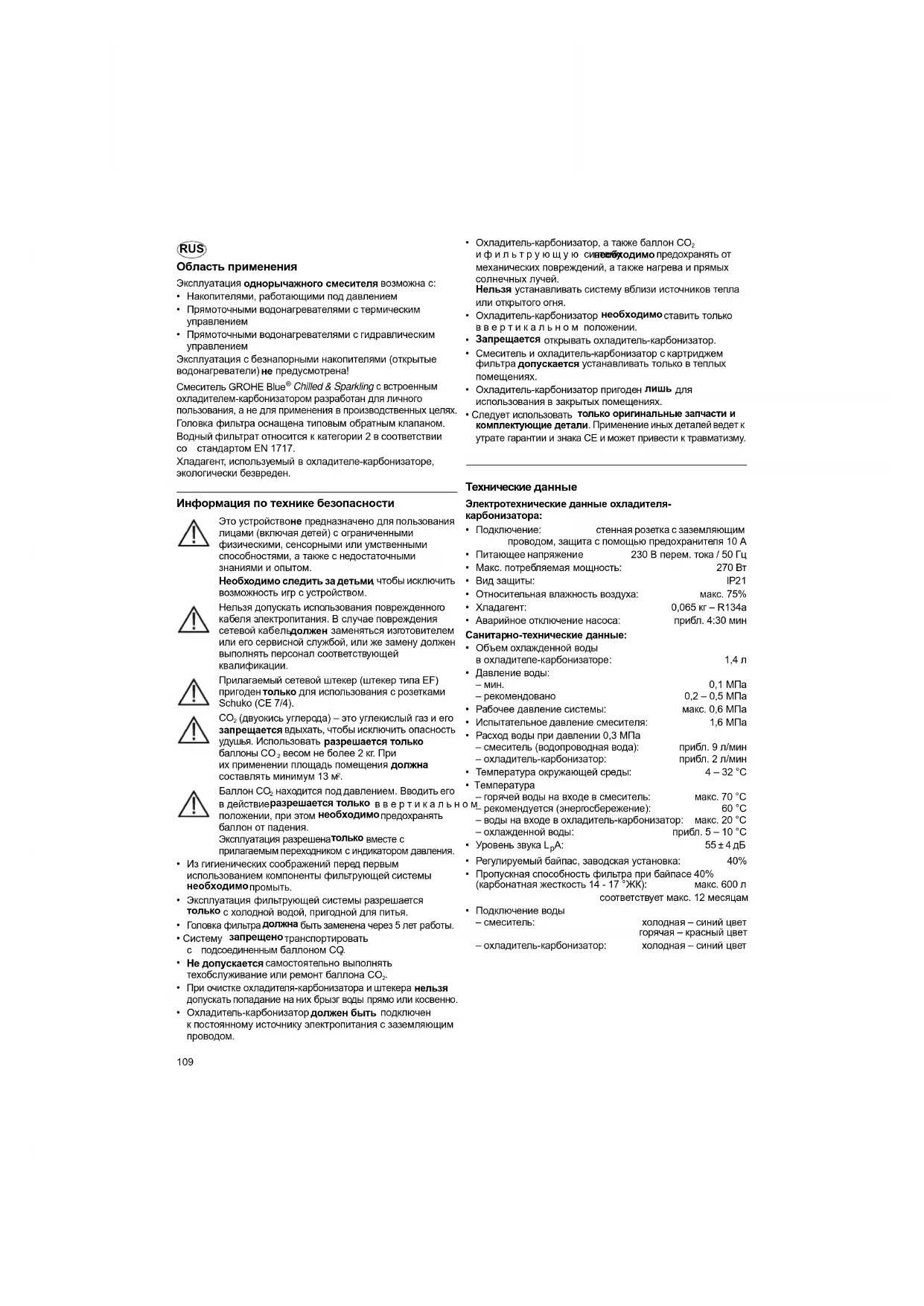 Chilled & Sparkling с встроенным охладителем-карбонизатором разработан для личного пользования, а не для применения в производственных целях. Головка фильтра оснащена типовым обратным клапаном. Водный фильтрат относится к категории 2 в соответствии со стандартом EN 1717. Хладагент, используемый в охладителе-карбонизаторе, экологически безвреден. Информация по технике безопасности Это устройство