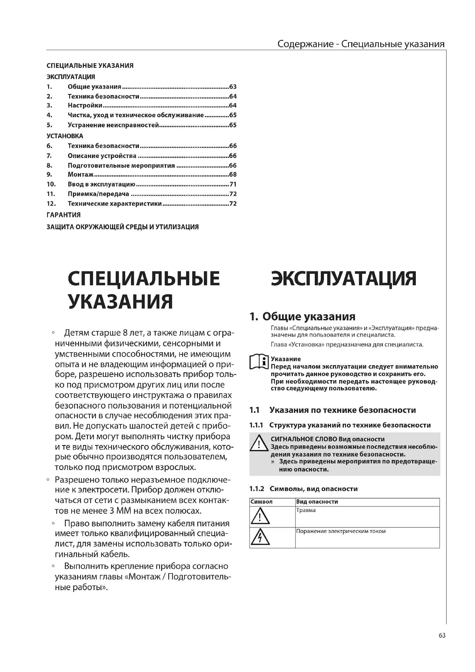 Главы «Специальные указания» и «Эксплуатация» предна-значены для пользователя и специалиста.Глава «Установка» предназначена для специалиста. УказаниеПеред началом эксплуатации следует внимательно прочитать данное руководство и сохранить его.При необходимости передать настоящее руковод-ство следующему пользователю.1.1 Указания по технике безопасности1.1.1 Структура указаний по технике безопасности