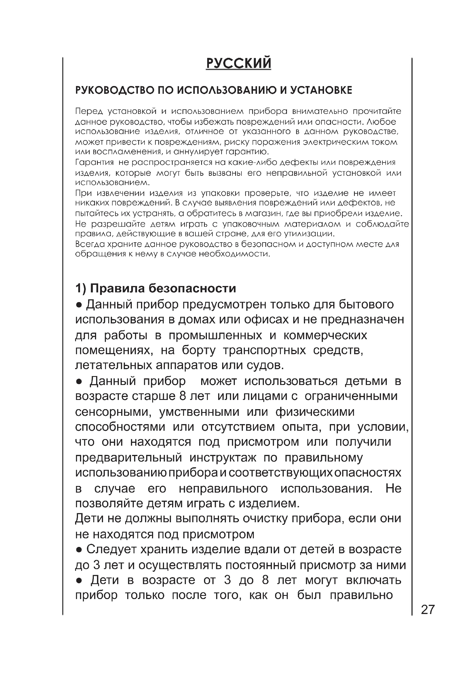 Prosimy o zlikwidowanie opakowania zgodnie z regułami unie- szkodliwiania odpadów obowiązującymi w Państwa kraju w celu ochrony środowiska. Likwidacja przestarzałego sprzętu Urządzenia z tym symbolem nie mogą być zlikwidowane na za- sadach ogólnych reguł odpadów domowych. Muszą być prze- chowywane oddzielnie i przekazane wyspecjalizowanym centrom zbiórki zgodnie z zasadami władz lokalnych. 26РУССКИЙ РУКОВОДСТВО ПО ИСПОЛЬЗОВАНИЮ И УСТАНОВКЕ Перед установкой и использованием прибора внимательно прочитайте данное руководство, чтобы избежать повреждений или опасности. Любое использование изделия, отличное от указанного в данном руководстве, может привести к повреждениям, риску поражения электрическим током или воспламенения, и аннулирует гарантию. Гарантия не распространяется на какие-либо дефекты или повреждения изделия, которые могут быть вызваны его неправильной установкой или использованием. При извлечении изделия из упаковки проверьте, что изделие не имеет никаких повреждений. В случае выявления повреждений или дефектов, не пытайтесь их устранять, а обратитесь в магазин, где вы приобрели изделие. Не разрешайте детям играть с упаковочным материалом и соблюдайте правила, действующие в вашей стране, для его утилизации. Всегда храните данное руководство в безопасном и доступном месте для обращения к нему в случае необходимости.