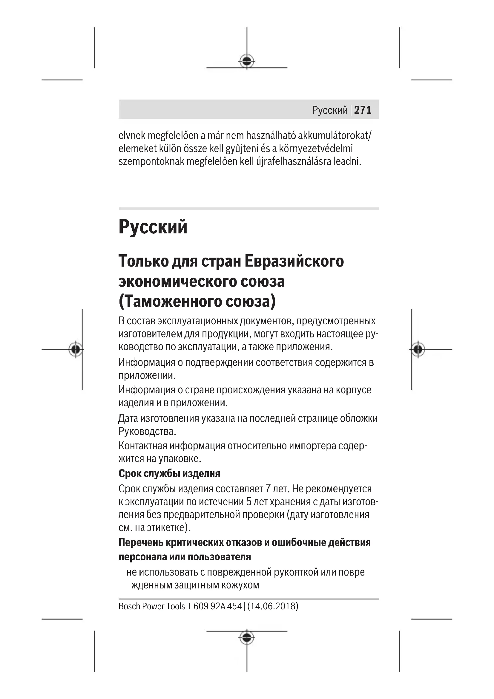 Toлько для стран Евразийского экономического союза (Таможенного союза) В состав эксплуатационных документов, предусмотренных изготовителем для продукции, могут входить настоящее ру- ководство по эксплуатации, а также приложения. Информация о подтверждении соответствия содержится в приложении. Информация о стране происхождения указана на корпусе изделия и в приложении. Дата изготовления указана на последней странице обложки Руководства. Контактная информация относительно импортера содер- жится на упаковке. Срок службы изделия Срок службы изделия составляет 7 лет. Не рекомендуется к эксплуатации по истечении 5 лет хранения с даты изготов- ления без предварительной проверки (дату изготовления см. на этикетке). Перечень критических отказов и ошибочные действия персонала или пользователя – не использовать с поврежденной рукояткой или повре- жденным защитным кожухом Русский | 271 Bosch Power Tools 1 609 92A 454 | (14.06.2018)272 | Русский 1 609 92A 454 | (14.06.2018) Bosch Power Tools – не использовать при появлении дыма непосредственно из корпуса изделия – не использовать с перебитым или оголенным электриче- ским кабелем – не использовать на открытом пространстве во время до- ждя (в распыляемой воде) – не включать при попадании воды в корпус – не использовать при сильном искрении – не использовать при появлении сильной вибрации Критерии предельных состояний – перетёрт или повреждён электрический кабель – поврежден корпус изделия Тип и периодичность технического обслуживания Рекомендуется очистить инструмент от пыли после каждо- го использования.