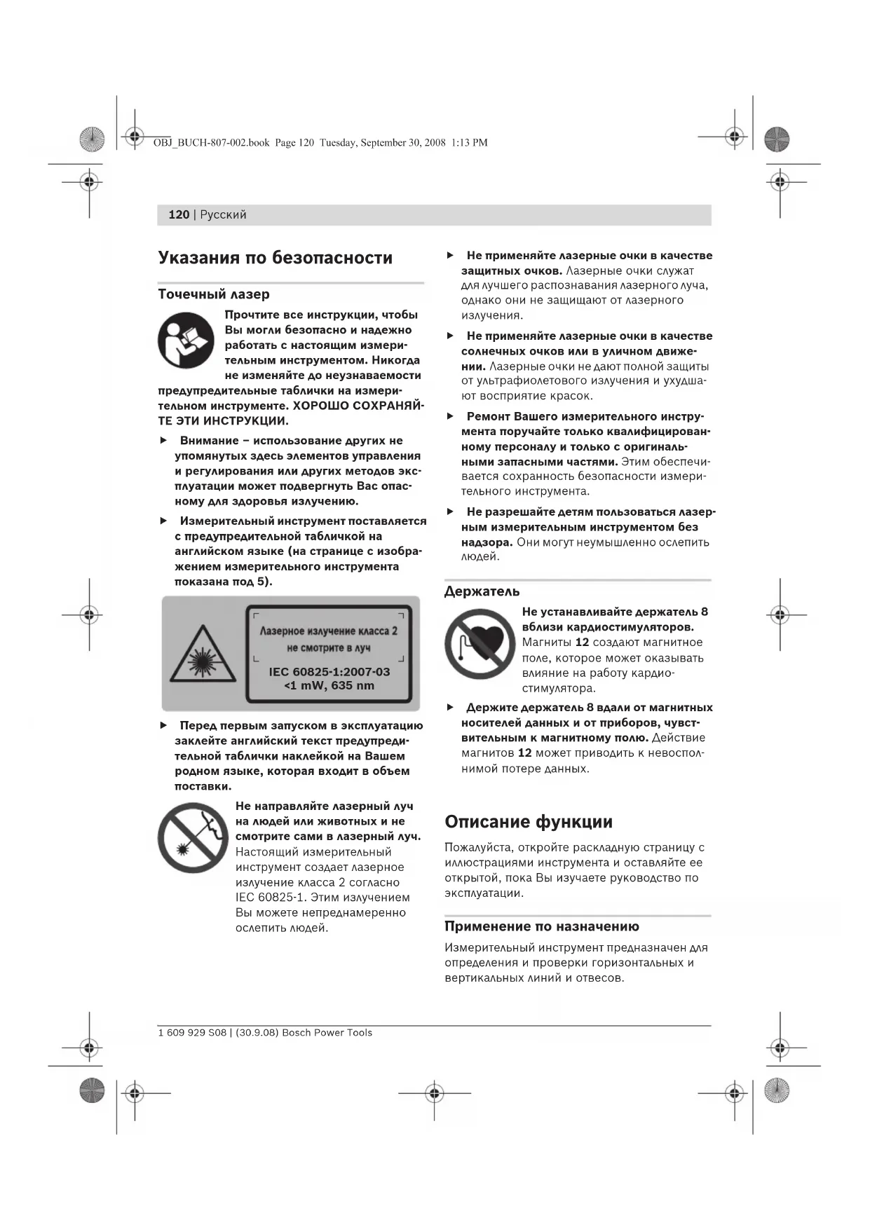 Указания по безопасности Точечный лазер Прочтите все инструкции, чтобы Вы могли безопасно и надежно работать с настоящим измери- тельным инструментом. Никогда не изменяйте до неузнаваемости предупредительные таблички на измери- тельном инструменте. ХОРОШО СОХРАНЯЙ- ТЕ ЭТИ ИНСТРУКЦИИ. f Внимание – использование других не упомянутых здесь элементов управления и регулирования или других методов экс- плуатации может подвергнуть Вас опас- ному для здоровья излучению. f Измерительный инструмент поставляется с предупредительной табличкой на английском языке (на странице с изобра- жением измерительного инструмента показана под 5). f Перед первым запуском в эксплуатацию заклейте английский текст предупреди- тельной таблички наклейкой на Вашем родном языке, которая входит в объем