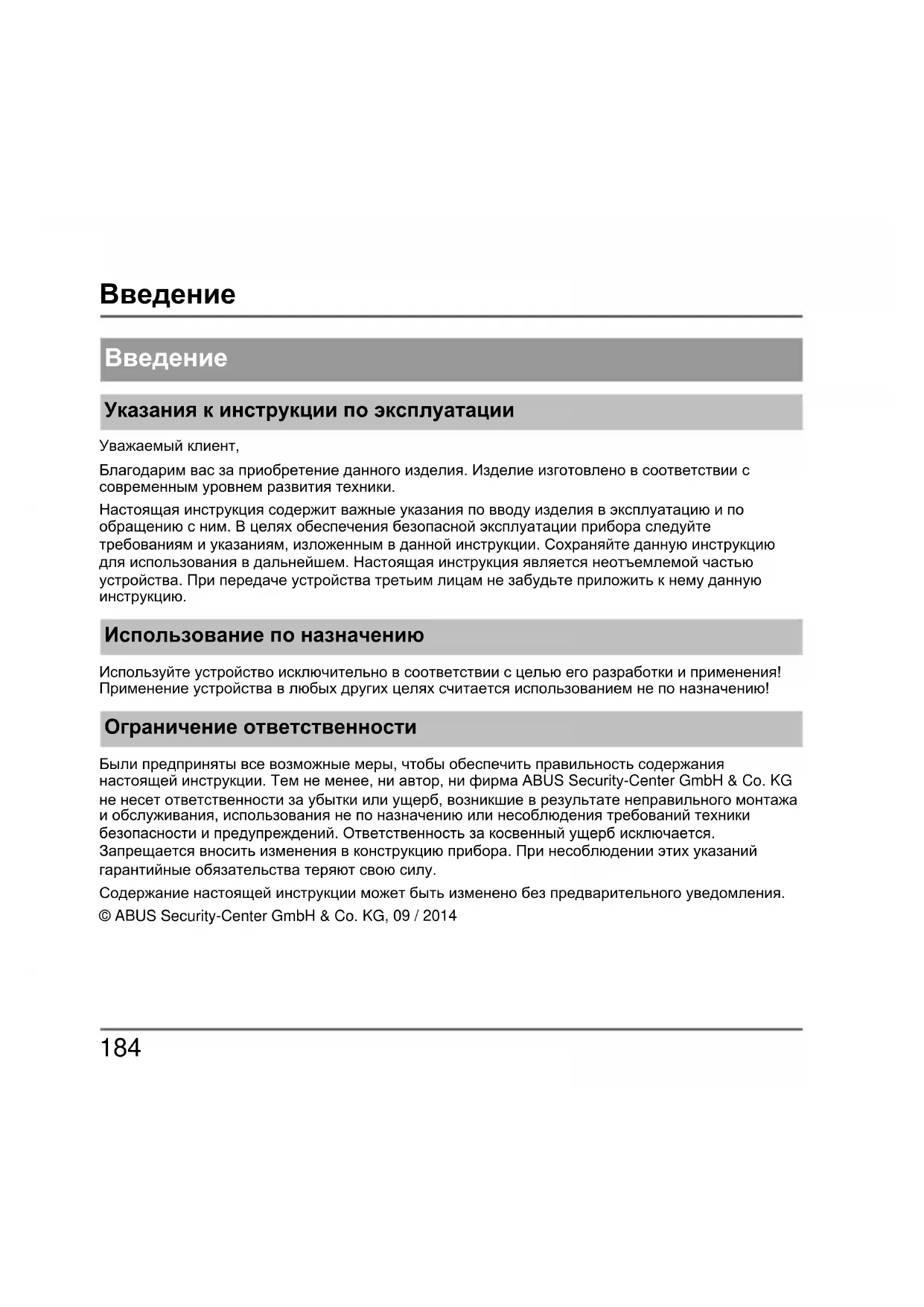 Указания к инструкции по эксплуатации Уважаемый клиент, Благодарим вас за приобретение данного изделия. Изделие изготовлено в соответствии с современным уровнем развития техники. Настоящая инструкция содержит важные указания по вводу изделия в эксплуатацию и по обращению с ним. В целях обеспечения безопасной эксплуатации прибора следуйте требованиям и указаниям, изложенным в данной инструкции. Сохраняйте данную инструкцию для использования в дальнейшем. Настоящая инструкция является неотъемлемой частью устройства. При передаче устройства третьим лицам не забудьте приложить к нему данную инструкцию. Использование по назначению Используйте устройство исключительно в соответствии с целью его разработки и применения! Применение устройства в любых других целях считается использованием не по назначению! Ограничение ответственности Были предприняты все возможные меры, чтобы обеспечить правильность содержания настоящей инструкции. Тем не менее, ни автор, ни фирма ABUS Security-Center GmbH & Co. KG не несет ответственности за убытки или ущерб, возникшие в результате неправильного монтажа и обслуживания, использования не по назначению или несоблюдения требований техники безопасности и предупреждений. Ответственность за косвенный ущерб исключается. Запрещается вносить изменения в конструкцию прибора. При несоблюдении этих указаний гарантийные обязательства теряют свою силу. Содержание настоящей инструкции может быть изменено без предварительного уведомления. © ABUS Security-Center GmbH & Co. KG, 09 / 2014Указания по технике безопасности