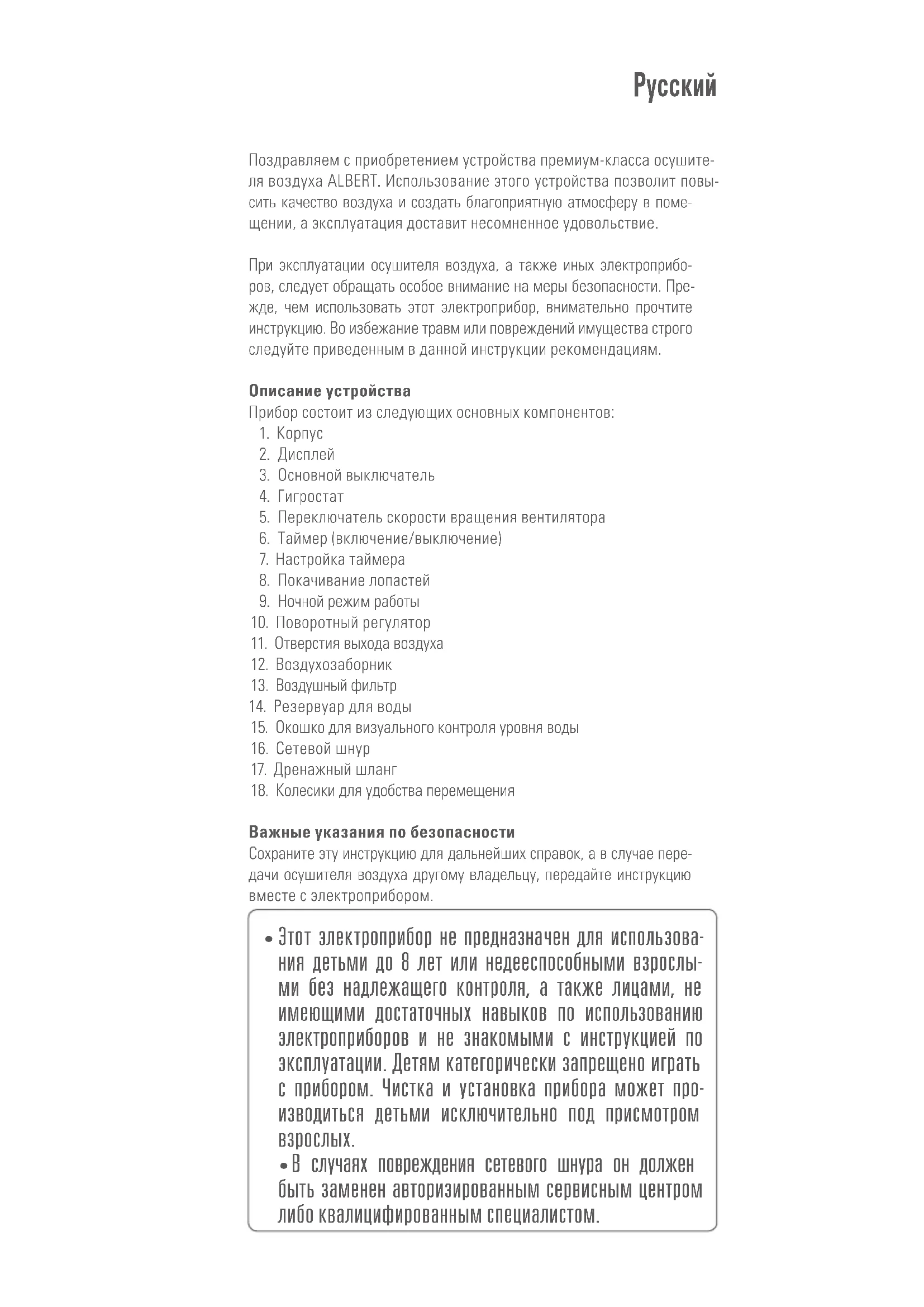 Важные указания по безопасности Сохраните эту инструкцию для дальнейших справок, а в случае пере- дачи осушителя воздуха другому владельцу, передайте инструкцию вместе с электроприбором.
