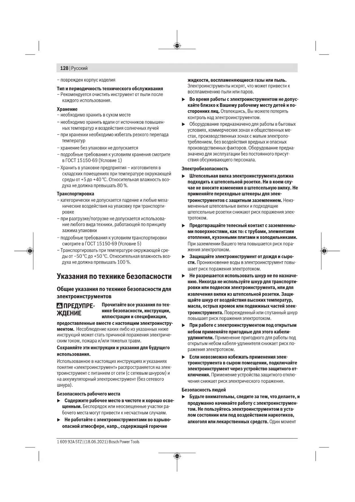 – не включать при попадании воды в корпус Критерии предельных состояний – перетёрт или повреждён электрический кабель Bosch Power Tools 1 609 92A 5TZ | (18.06.2021)128 | Русский – поврежден корпус изделия Тип и периодичность технического обслуживания – Рекомендуется очистить инструмент от пыли после каждого использования.