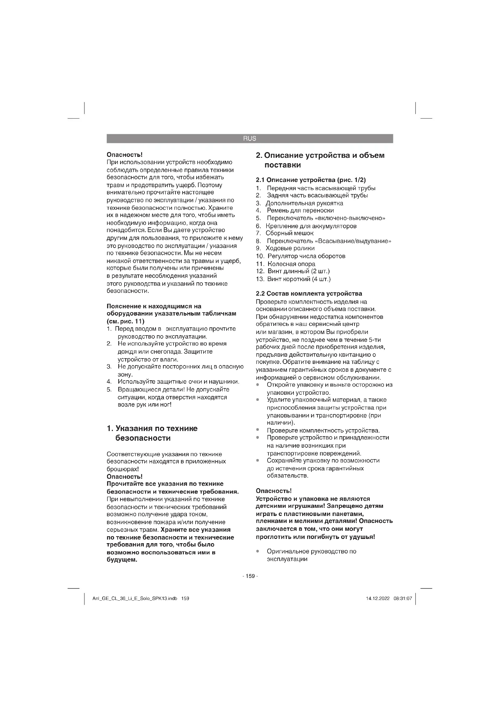 воздействия вибрации на руку при длительном использовании устройства или при неправильном пользовании и ненадлежащем техническом уходе. Anl_GE_CL_36_Li_E_Solo_SPK13.indb 160Anl_GE_CL_36_Li_E_Solo_SPK13.indb 160 14.12.2022 08:31:0814.12.2022 08:31:08RUS