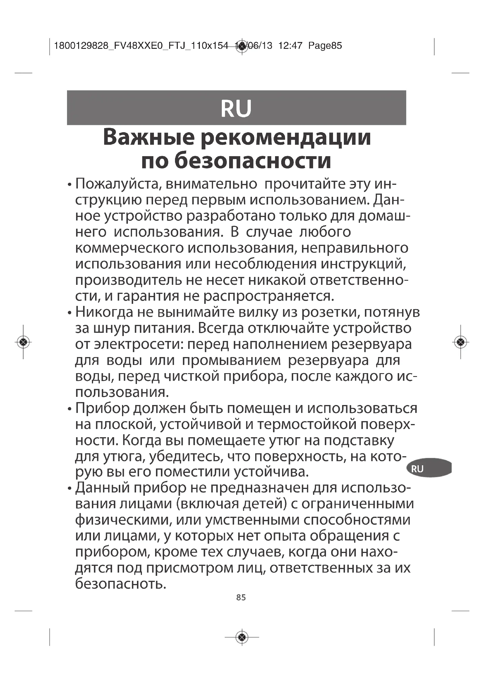 - Данный прибор не предназначен для использо- вания лицами (включая детей) с ограниченными физическими, или умственными способностями или лицами, у которых нет опыта обращения с прибором, кроме тех случаев, когда они нахо- дятся под присмотром лиц, ответственных за их безопасноть. 1800129828_FV48XXE0_FTJ_110x154 18/06/13 12:47 Page8586