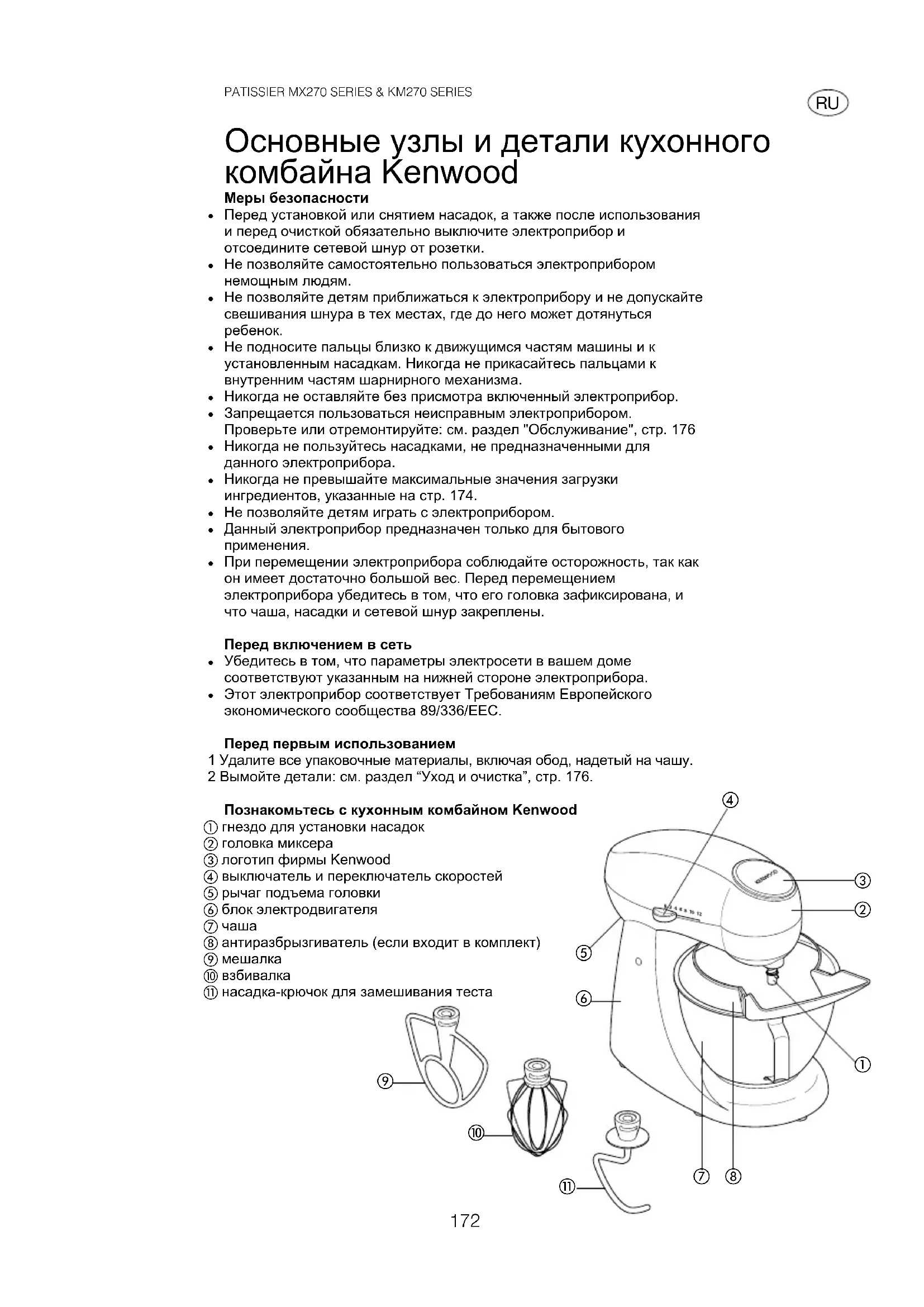 Этот электроприбор соответствует Требованиям Европейского экономического сообщества 89/336/ЕЕС. Перед первым использованием 1 Удалите все упаковочные материалы, включая обод, надетый на чашу. 2 Вымойте детали: см. раздел “Уход и очистка”, стр. 176. Познакомьтесь с кухонным комбайном Kenwood гнездо для установки насадок головка миксера логотип фирмы Kenwood выключатель и переключатель скоростей рычаг подъема головки блок электродвигателя