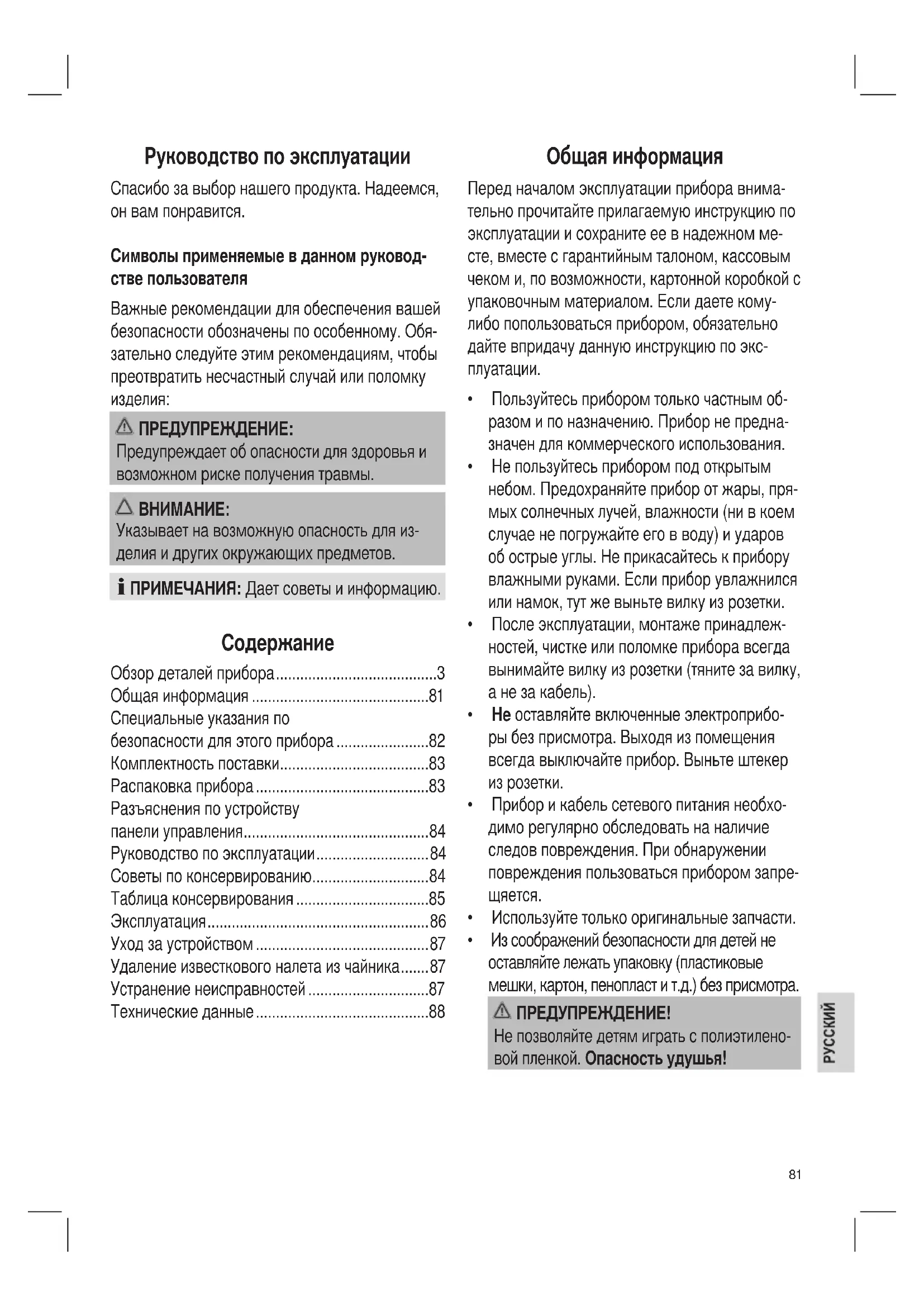 - Изсоображенийбезопасностидлядетейне оставляйте лежать упаковку (пластиковые мешки, картон, пенопласт и т.д.) без присмотра. ПРЕДУПРЕЖДЕНИЕ! Непозволяйтедетямигратьсполиэтилено- вой пленкой. Опасность удушья!82 Специальные указания по безопасности для этого прибора Нaиздeлииможнoyвидeтьcлeдyющyюпиктoгpaммycпpeдyпpe- ждeниями или инфopмaциeй: ПРЕДУПРЕЖДЕНИЕ: Горячая поверхность! Риск получения ожогов! Во время и после использования чайника температура доступ- ных поверхностей будет очень высокой.