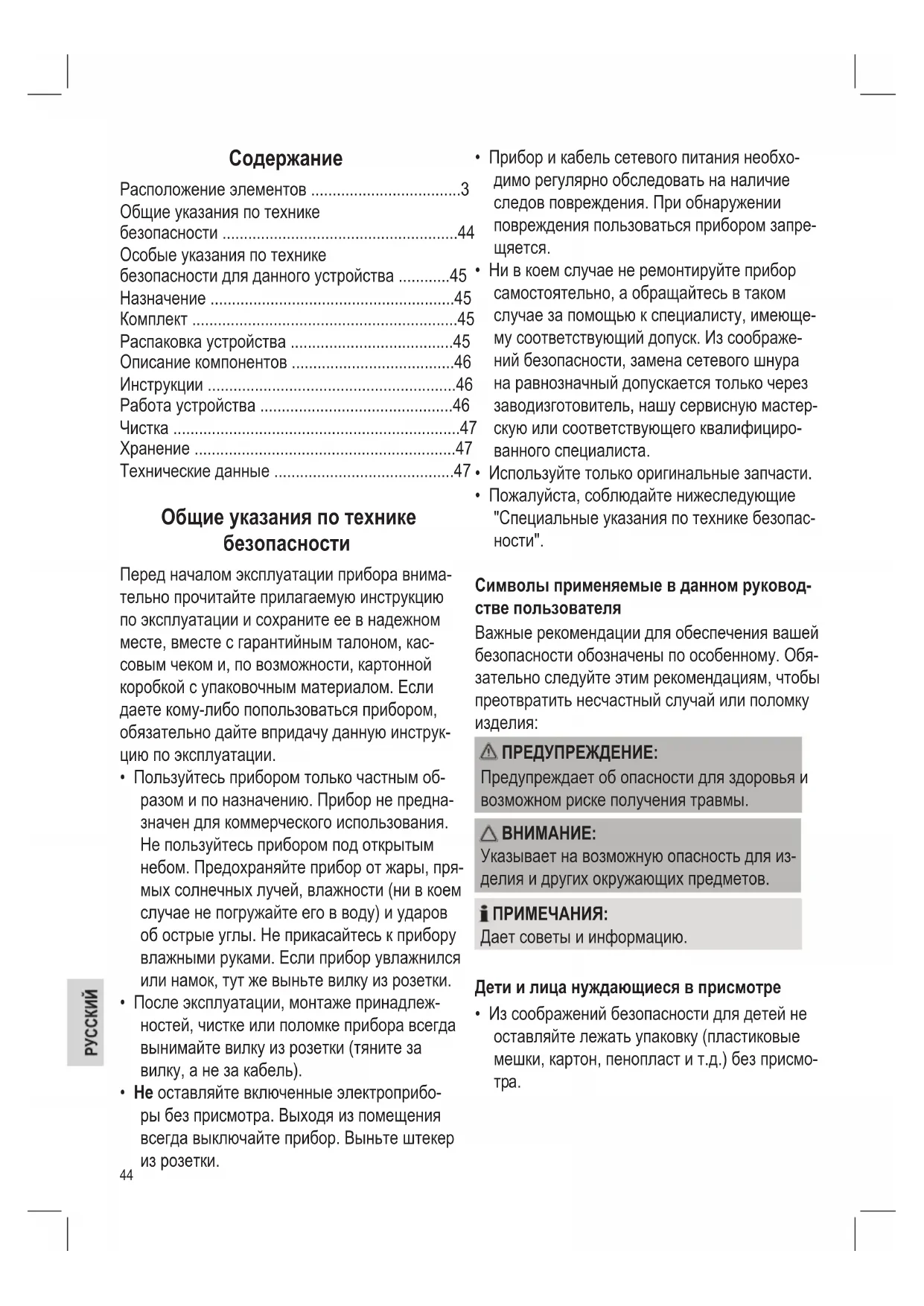 - Технические данные Общие указания по технике безопасности Перед началом эксплуатации прибора внима- тельно прочитайте прилагаемую инструкцию по эксплуатации и сохраните ее в надежном месте, вместе с гарантийным талоном, кас- совым чеком и, по возможности, картонной коробкой с упаковочным материалом. Если даете кому-либо попользоваться прибором, обязательно дайте впридачу данную инструк- цию по эксплуатации. p. 47