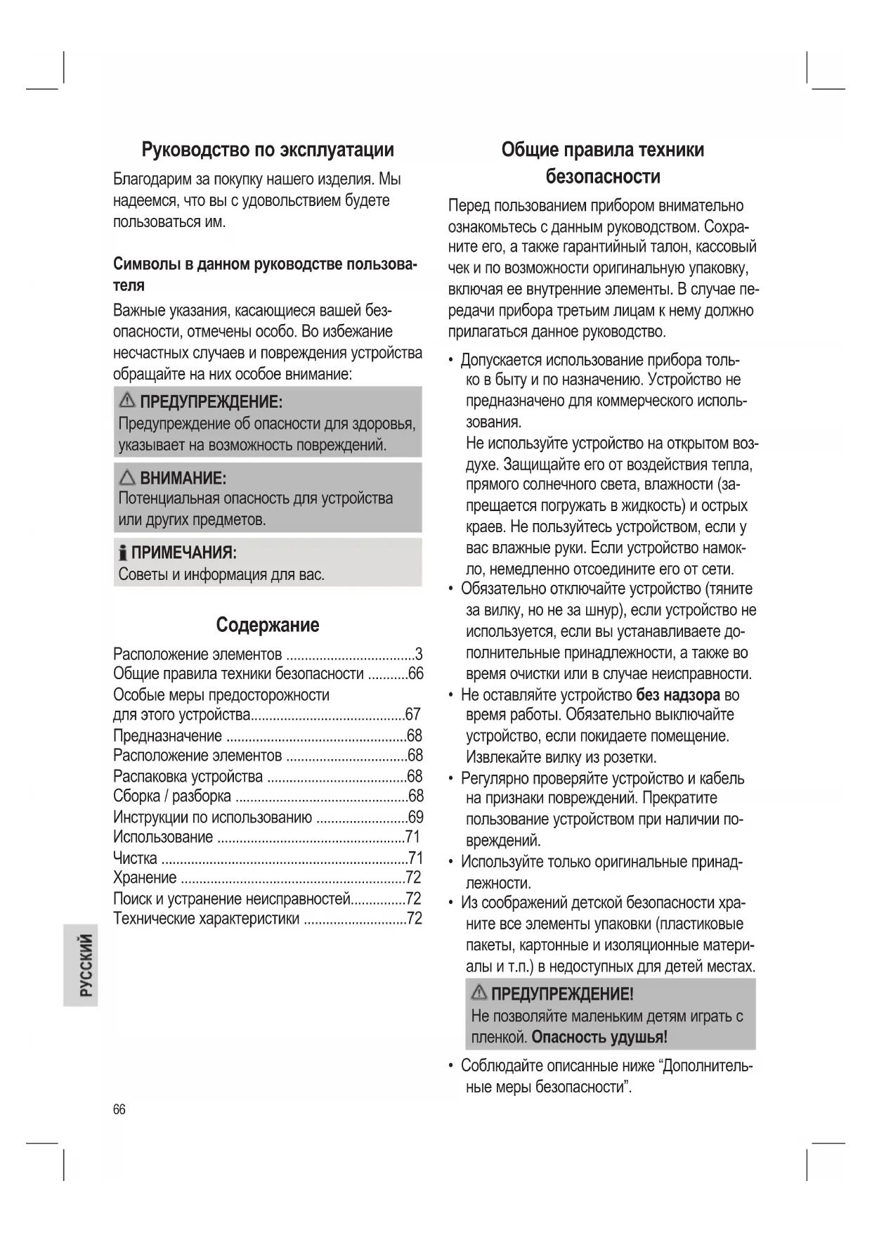 - Технические характеристики Общие правила техники безопасности Перед пользованием прибором внимательно ознакомьтесь с данным руководством. Сохра- ните его, а также гарантийный талон, кассовый чек и по возможности оригинальную упаковку, включая ее внутренние элементы. В случае пе- редачи прибора третьим лицам к нему должно прилагаться данное руководство. p. 72
